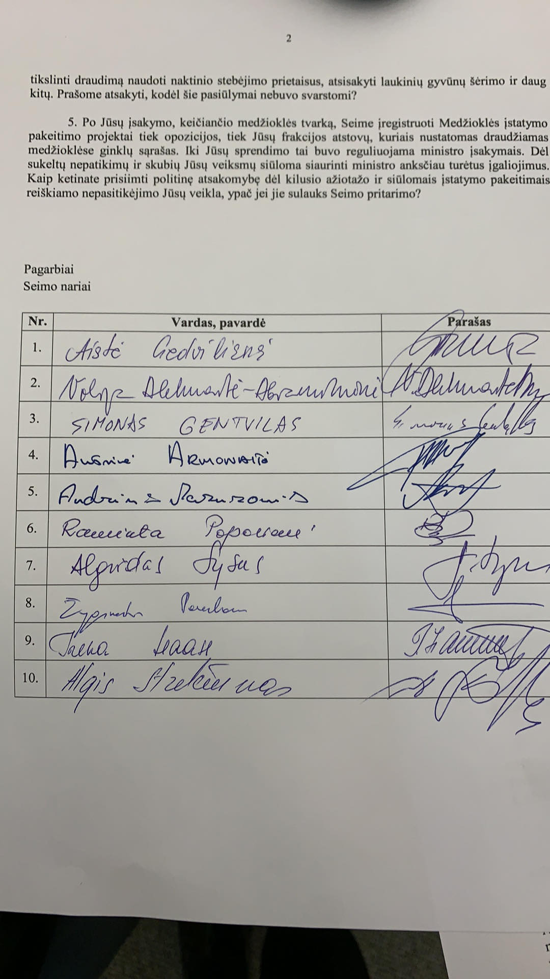 Seimo narių grupė stebisi, kad viešai paskelbtame medžioklės tvarkos keitimo projekte siūlymas įteisinti medžioklės su lankais nebuvo įtrauktas į paketą, ir klausia, gal ministras patiria neteisėtą̨ kažkieno spaudimą̨ ir gal gali konkrečiai įvardyti visas interesų grupes bei asmenis, kurie taip atkakliai verčia ministrą imtis šios iniciatyvos. Taip pat norima sužinoti, kas konkrečiai pasiūlė įtraukti medžioklės su lankais būdą̨ į patvirtintą medžioklės tvarką ir kodėl tai atsirado apeinant įprastas teisines procedūras.