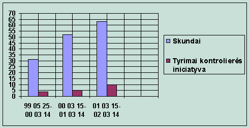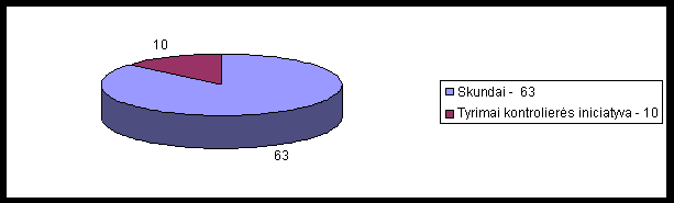Taigi, palyginus su dviem praėjusiais ataskaitiniais laikotarpiais, skundų bei kontrolierės iniciatyva atliktų tyrimų skaičius žymiai padidėjo. Jeigu per pirmąjį ataskaitinį laikotarpį buvo gautas 31 skundas, kontrolierės iniciatyva atlikti 4 tyrimai, per praėjusįjį ataskaitinį laikotarpį buvo gauti 52 skundai ir kontrolierės iniciatyva atlikti 5 tyrimai, tai per šį ataskaitinį laikotarpį buvo gauti jau 63 skundai ir kontrolierės iniciatyva atlik ta 10 tyrimų dėl galimų moterų ir vyrų lygių galimybių pažeidimų (2pav.).