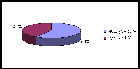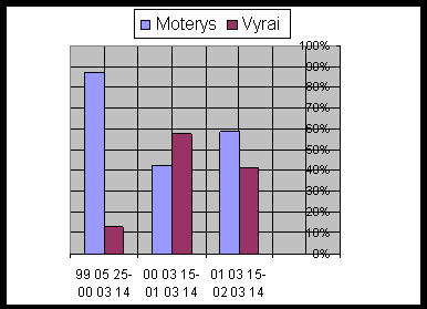 Apibendrinant visus tris Moterų ir vyrų lygių galimybių kontrolieriaus tarnybos atsiskaitomuosius laikotarpius, pažymėtina, kad didžiąją daugumą besikreipiančių asmenų sudaro moterys, išskyrus praėjusįjį ataskaitinį laikotarpį (2000 03 15 2001 03 14) kai į tarnybą dėl savo pažeistų teisių žymiai dažniau kreipėsi vyrai (4 pav.).