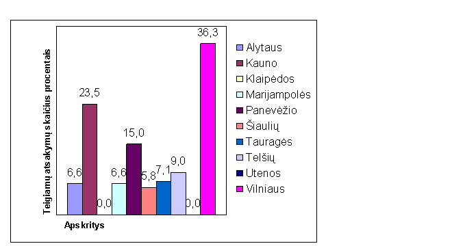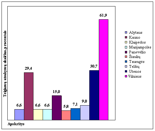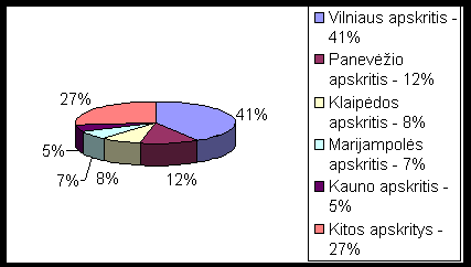 Apibendrinus duomenis, paaiškėjo, kad ir per šį ataskaitinį laikotarpį, kaip ir per abu praėjusius, dažniau į Moterų ir vyrų lygių galimybių kontrolieriaus tarnybą kreipėsi Vilniaus gyventojai. Tokį didelį Vilniaus ir visos Vilniaus apskrities gyventojų aktyvumą sąlygoja ir patogi Moterų ir vyrų lygių galimybių kontrolieriaus tarnybo s geografinė padėtis, ir didesnis skaičius sostinėje vykstančių įvairių renginių, konferencijų, seminarų lyčių lygybės klausimais, kas, beje, taip pat labiau pasiekiama vilniečiams. Tačiau apskričių, rajonų centrų gyventojai yra ne mažiau aktyvūs, gindami savo pažeistas teises (5 pav.). Moterų ir vyrų lygių galimybių kontrolieriaus tarnyba neturi struktūrinių padalinių Lietuvos apskrityse bei neturi galimybių tiesiogiai bendrauti, padėti, konsultuoti atokiausių Lietuvos kampelių gyventojų. Pažymėtina, kad per ataskaitinį laikotarpį visai nebuvo gauta skundų iš Alytaus ir Telšių apskričių, o tai pat iš kaimo vietovių gyventojų.