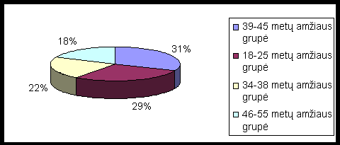 Apibendrinus duomenis apie besikreipiančiųjų į Moterų ir vyrų lygių galimybių kontrolieriaus tarnybą amžių pažymėtina, kad kaip ir per praėjusius atsiskaitomuosius laikotarpius, taip ir per šį atsiskaitomąjį laikotarpį aktyviausi yra brandaus amžiaus sulaukę Lietuvos gyventojai. Tai 46-55 metų amžiaus sulaukę moterys ir vyrai, baigę mokslus, įgiję vieną ar net kelias specialybes, sukaupę profesinių įgūdžių ir žinių, tačiau susidūrę su savo teisių pažeidimais ir nenorintys su tuo taikstytis. Beje, šiais metais aktyviai į Moterų ir vyrų lygių galimybių kontrolieriaus tarnybą kreipėsi ir žymiai jaunesni, t.y. 18-25 metų amžiaus asmenys, neturintys išsilavinimo, arba jį turintys, tačiau nesėkmingai bandantys įsidarbinti, ar realizuoti savo teises darbinėje veikloje. (7 pav.). 7 pav. Asmenų, pateikusių skundus Moterų ir vyrų lygių galimybių kontrolieriaus tarnybai, pasiskirstymas pagal amžių: