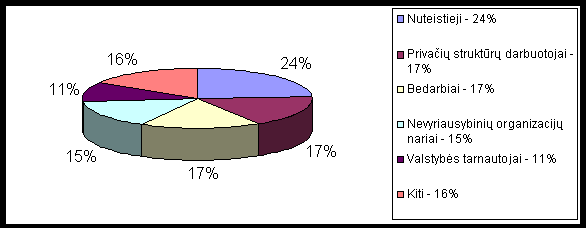 Apibendrinus duomenis, kurie yra nurodomi skunde, prašyme ir kuriais remiantis galima nustatyti, kokiai socialinei grupei priklauso besikreipiantis asmuo, pastebėta, kad per šį atsiskaitomąjį laikotarpį labai aktyvūs buvo nuteistieji, kurie jautėsi diskriminuojami dėl lyties. Nemažiau aktyvūs buvo nevyriausybinių organizacijų nariai ir bedarbiai. Palyginus su praėjusiais atsiskaitomaisiais laikotarpiais, šiais ir praėjusiais metais žymiai sumažėjo besikreipiančių valstybės tarnautojų skaičius, tačiau padaugėjo privačių struktūrų darbuotojų, pateikusių skundus dėl moterų ir vyrų lygių teisių pažeidimo (8 pav.).
