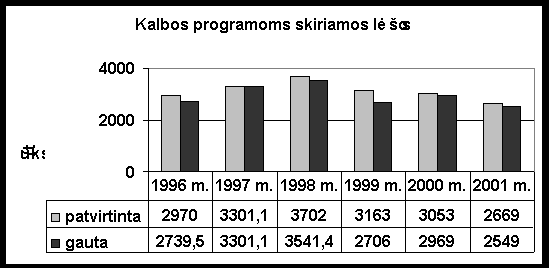 2001 m. iš įvairių institucijų ir asmenų gauta 618 raštų, išsiųsta 761 raštas. 5. Kalbos programos 2001 m. toliau vykdytos trys kalbos programos: ,,Valstybinės kalbos statuso įgyvendinimas ir jo apsauga (1.1), ,,Valstybinės kalbos norminimas. Visuomenės švietimas (1.2), ,,Lietuvių kalbos informacinėje visuomenėje 20002006 m. programa (1.4). Lietuvos Respublikos Vyriausybė kalbos programų darbams atlikti 2001 m. skyrė 2669 tūkst. Lt (darbo užmokestis 1439 tūkst. Lt, socialinio draudimo įmokos 446 tūkst. Lt, leidyba 331,8 tūkst. Lt, kitos prekės 4,2 tūkst. Lt, spaudiniai 1,3 tūkst. Lt, komandiruotės 52,7 tūkst. Lt, kitos išlaidos 394,0 tūkst. Lt), iš jų: ,,Valstybinės kalbos statuso įgyvendinimas ir jo apsauga 200 tūkst. Lt (darbo užmokestis 139,0 tūkst. Lt, soc. draudimo įmokos 43,0 tūkst. Lt, leidyba 17,6 tūkst. Lt, kitos prekės 0,4 tūkst. Lt); ,,Valstybinės kalbos norminimas. Visuomenės švietimas 2020 tūkst. Lt (darbo užmokestis 1300,0 tūkst. Lt, soc. draudimo įmokos 403,0 tūkst. Lt, leidyba 314,2 tūkst. Lt, kitos prekės 1,1 tūkst. Lt, komandiruotės 0,7 tūkst. Lt, kitos išlaidos 1,0 tūkst. Lt); Lietuvių kalbos informacinėje visuomenėje 20002006 m. programa 449,0 tūkst. Lt (spaudiniai 1,3 tūkst. Lt, kitos prekės 2,7 tūkst. Lt, komandiruotės 52,0 tūkst. Lt, kitos išlaidos 393,0 tūkst. Lt). 2001 m. liepos 12 d. Lietuvos Respublikos 2001 m. valstybės biudžeto ir savivaldybių biudžetų finansinių rodiklių patvirtinimo įstatymo pakeitimo įstatymu Nr. IX-454, 2001 m. rugpjūčio 6 d. Lietuvos Respublikos Vyriausybės nutarimu Nr. 969 Kalbos komisijos asignavimai sumažinti 87,0 tūkst. Lt, iš jų: 1.2 programai 60,0 tūkst. Lt (leidyba) ir 1.4 programai 27,0 tūkst. Lt (kitos išlaidos). 2001 m. IV ketvirtyje negauta 32,6 tūkst. Lt, iš jų: 1.1 programai 1,5 tūkst. Lt (leidyba), 1.4 programai 32,0 tūkst. Lt (kitos išlaidos). Lietuvos Respublikos Vyriausybė 2001 m. kalbos programų asignavimus sumažino 119,6 tūkst. Lt.