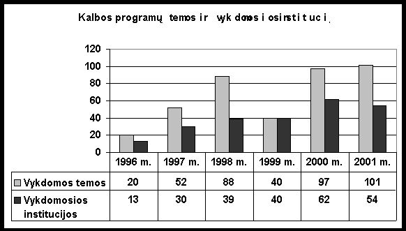 5.1. Kalbos programų koordinavimo tarybų veikla 2001 m. įvyko 11 kalbos programų koordinavimo tarybų posėdžių (13 val.). 1.1 ir 1.2 programų Koordinavimo taryba posėdžiavo 9 kartus (11 val.). Šios tarybos posėdžiuose paskirstytos 2001 m. 1.1 ir 1.2 programų lėšos institucijoms, atliekančioms darbus pagal sutartis, svarstytas 2001 m. Kalbos programoms skirtų paprastųjų išlaidų mažinimo planas, patvirtintos Koordinavimo ir Ekspertų tarybų narių darbo sąnaudos bei kviestinių ekspertų darbo užmokesčio tarifikacija, apsvarstytos ir patvirtintos programų darbus vykdančių institucijų ketvirčių ataskaitos, apsvarstytos 2001 m. paraiškos darbams atlikti, paskirti pateiktų darbų ir paraiškų recenzentai bei patvirtintos recenzijų ir ekspertizių išvados. 2001 m. balandžio 3 d. Koordinavimo tarybos posėdyje nutarta skelbti paraiškų priėmimą 2001 m. Atsižvelgiant į vartotojų poreikius, pirmenybė teikta teisės, ekonomikos ir švietimo terminų žodynams rengti. Be nurodytų žodynų, paraiškos priimtos šiems darbams: filologiniams žodynams (Programos 1.4 ir 4.1.2 punktai), kalbos kultūros ir kalbos praktikos leidiniams (4.2.3 p.), kalbos kultūros ir specialybės kalbos mokomiesiems leidiniams (2.4.2, 2.4.3, 4.3 p.), kalbos mokslo paveldo veikalams (4.1.4 p.), kompiuteriniams kalbos duomenų bankams (1.15 p.), mokslo terminų žodynams (4.2.2 p.), raštijos paminklų rengimui ir leidybai (1.3 ir 4.1.3 p.), tarmių tekstams ir tarmių žodynams (1.5 ir 4.1.5 p.). Iš 23 institucijų gautos 34 paraiškos, jose prašyta finansuoti 42 darbus. Tarp pateikėjų 5 aukštosios mokyklos, 3 mokslo institutai, 5 draugijos bei centrai, 7 leidyklos ir kt. 11-oje paraiškų prašyta paremti terminų žodynų rengimą ir leidybą, 9-iose kitakalbių valstybinės kalbos mokymo kursus, mokomųjų priemonių (žodynų, vadovėlių) rengimą ir leidybą, 3-ose kompiuterinių kalbos duomenų bankų rengimą, 2-ose kalbos kultūros ir kalbos praktikos leidinių rengimą ir kt. Įvairios leidyklos iš Programos lėšų 2002 m. buvo numačiusios išleisti 17 knygų. Paraiškose numatytų darbų sąmatinė vertė 1906 tūkst. Lt. Paraiškų ekspertais nutarta skirti: doc. dr. S. Keinį, dr. J. Klimavičių, prof. habil. dr. A. Rosiną, prof. habil. dr. A. Smilgevičių, A. Umbrasą, P. Zemlevičiūtę (terminų žodynai), prof. habil. dr. V. Ambrazą, dr. R. Petrokienę, prof. habil. dr. A. Rosiną, prof. habil. dr. Z. Zinkevičių (kompiuteriniai kalbos duomenų bankai), doc. dr. B. Dobrovolskį, dr. L. Murinienę (kitakalbių mokymas; mokomosios priemonės, kalbos kultūros ir kalbos praktikos leidiniai), prof. habil. dr. A. Pakerį, prof. habil. dr. A. Rosiną, prof. habil. dr. B. Stundžią (lietuvių kalbos tyrimai, žodynai ir kt.), prof. habil. dr. A. Pakerį, prof. habil. dr. A. Rosiną, prof. habil. dr. B. Stundžią, prof. habil. dr. Z. Zinkevičių (leidyba). 2001 m. birželio 27 d. posėdyje apsvarstytos paraiškų ekspertizės: neremtinomis pripažinta 10 paraiškų. Nutarta netenkinti paraiškų, neatitinkančių Programos darbams keliamų reikalavimų. Lietuvių kalbos informacinėje visuomenėje 20002006 m. programos Koordinavimo taryba posėdžiavo 2 kartus (2 val.). Posėdžiuose paskirstytos 1.4 programos lėšos institucijoms, atliekančioms darbus pagal sutartis, numatyti prioritetiniai darbai, svarstytos paraiškos ir ketvirčių ataskaitos. 2001 m. birželį parengtas ir patvirtintas kalbos programų 2002 m. biudžeto projektas bei numatomos 2003 ir 2004 m. biudžeto asignavimų apimtys. 2002 m. nutarta remti 2000 m. lapkričio 6 d. Lietuvos Respublikos Vyriausybės nutarimu Nr. 1340 patvirtintas programas Tarmių ir etninių vietovardžių išsaugojimo 20012010 m. programą ir Svetimžodžių keitimo lietuviškais atitikmenimis tvarką. 5.2. Ekspertų tarybos veikla Atliktos 77 Kalbos komisijai pateiktų leidinių rankraščių (terminų žodynų ir standartų, kalbos praktikos ir mokomųjų leidinių, monografijų ir kt.) ekspertizės gautos 128 recenzijos, leidinių rengėjams pateikta 81 bendra recenzija (žr. priedų 1 lentelę). Kalbos programų ekspertai atliko 57 paraiškų, programų, kalendorinių planų ir 35 metinių ataskaitų ekspertizes. 2001 m. surengti 94 Ekspertų tarybos posėdžiai (209 val.) (žr. priedų 2 lentelę ).5.3. Darbai pagal sutartis su institucijomis Programą Valstybinės kalbos statuso įgyvendinimas ir jo apsauga 2001 m. vykdė 20 institucijų (22 temos) (žr. priedų 3 lentelę), programą Valstybinės kalbos norminimas. Visuomenės švietimas 35 institucijos (70 temų) (žr. priedų 4 ir 6 lenteles), Lietuvių kalbos informacinėje visuomenėje 20002006 m. programą 4 institucijos (9 temos) (žr. priedų 5 lentelę ).