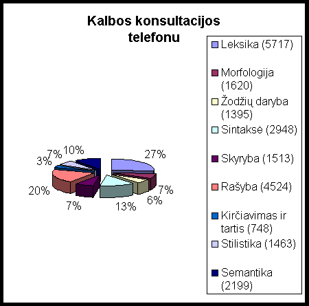 6. Šviečiamoji ir informacinė veikla 6.1. Informacija apie Kalbos komisijos veiklą Su Kalbos komisijos sudėtimi, istorija, veiklos kryptimis, priimtais nutarimais ir kt. galima susipažinti internete ( www.lrs.lt, žr. Institucijos, atskaitingos Seimui) lietuvių ir anglų kalbomis. Duomenys apie Komisijos veiklą lietuviškoje dalyje atnaujinami kas savaitę. Dienraštyje Lietuvos rytas kas mėnesį išeina Kalbos komisijos rengiama skiltis.Gegužės 8 d. Kalbos komisijoje buvo paskelbta Atvirų kabinetų diena, vyko atviras Gramatikos pakomisijo posėdis, su Kalbos komisijos ir Kalbos inspekcijos vadovais ir darbuotojais turėjo progos pabendrauti žurnalistai ir visuomenės atsto vai.6.2. Kalbos konsultacijos Kalbos konsultacijų telefonu punktai veikia Vilniuje, Kaune, Klaipėdoje ir Šiauliuose (Kauno, Klaipėdos ir Šiaulių punktų veikla finansuojama iš Valstybinės kalbos vartojimo ir ugdymo programos lėšų). Vilniaus konsultacijų punkte per metus užregistruotos 22 127 kalbos konsultacijos telefonu. Apibendrinus sukauptus duomenis matyti, kad daugiausia klausta leksikos, rašybos, sintaksės, semantikos dalykų, kiek mažiau morfologijos, skyrybos, stilistikos, mažiausiai kirčiavim o ir tarties dalykų (žr. diagramą Kalbos konsultacijos telefonu). Per dieną vidutiniškai buvo atsakoma į 90 klausimų.