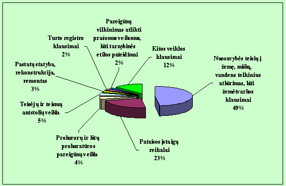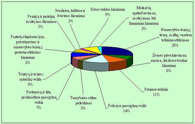 Per 2001 metus išnagrinėtas 231 piliečių skundas dėl pareigūnų piktnaudžiavimo ir biurokratizmo sprendžiant nuosavybės teisių į žemę, mišką, vandens telkinius atkūrimą, žemės pardavimą, valstybinės žemės nuomą, kompensacijos už žemę mokėjimą, kitus žemėtvarkos klausimus. Tarp visų išnagrinėtų skundų skundai dėl išvardytų problemų sudarė 52 procentus. Pažymėtina, kad 50,4 proc. išnagrinėtų skundų, susijusių su žemės reformos problematika, pripažinti pagrįstais.