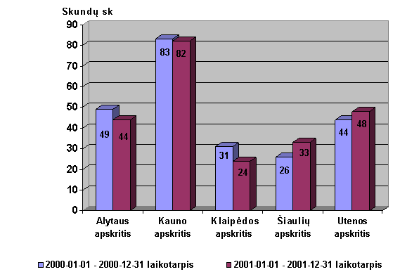 Palyginamieji duomenys apie skundų pasiskirstymą pagal apskritis 2000 ir 2001 metais matyti iš pateikiamų diagramų.