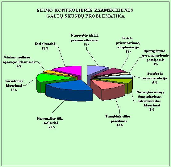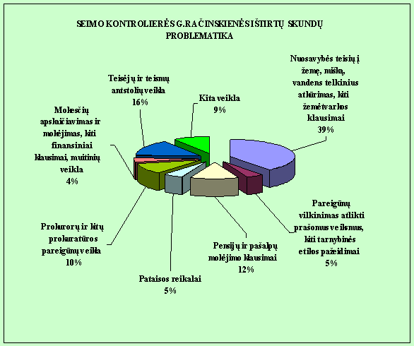 Seimo kontrolierius pagal Seimo kontrolierių įstaigos valdybos nutarimu patvirtintą Seimo kontrolierių pasiskirstymą veiklos sritimis tyrė skundus dėl Vilniaus, Kauno ir Panevėžio miestų savivaldybių pareigūnų piktnaudžiavimo ar biurokratizmo. BENDROSIOS PROBLEMOS Pagal Lietuvos Respublikos Seimo kontrolierių įstaigos valdybos 2000-01-10 nutarimą Nr. 1 Seimo kontrolierius R.Valentukevičius tiria piliečių skundus dėl Vilniaus, Kauno ir Panevėžio miestų savivaldybių pareigūnų biurokratizmo ir piktnaudžiavimo. Šių didžiųjų miestų savivaldybių priskyrimą minėtam kontrolieriui lėmė gana daug, palyginti su kitais rajonais, gaunamų skundų. 1 lentelė