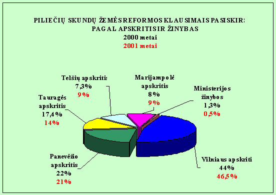 Iš pateiktų duomenų matyti, kad skundų skaičius ataskaitiniu laikotarpiu dėl nuosavybės teisių atkūrimo, lyginant su praeitu ataskaitiniu laikotarpiu, šiek tiek padidėjo (nuo 150 iki 164), tačiau procentinė išraiška rodo, kad šios kategorijos skundų kiekis nuo visų ištirtų sumažėjo (2000 m. buvo 62 proc. visų išnagrinėtų skundų, 2001 m. - 40 proc.) Kaip ir praėjusiu, taip ir šiuo ataskaitiniu laikotarpiu daugiausia skundų gauta dėl Vilniaus apskrities pareigūnų veiksmų. Nuosavybės teisių atkūrimo procesas problemiškiausiai vyksta Vilniaus mieste ir Vilniaus rajone. Dėl šių vietovių žemėtvarkos skyrių pareigūnų veiksmų ne kartą buvo atkreiptas tuometinių Vilniaus apskrities viršininkų (A.Vidūno, A.Kudzio) dėmesys, tačiau pastarųjų abejingumas nustatytiems piliečių teisių pažeidimams miesto žemėtvarkos skyriuje nepaskatino šio skyriaus vedėjo (šiuo metu - vedėjo pavaduotojas) ir kitų pareigūnų pertvarkyti skyriaus darbą ir sudarė prielaidas toliau pažeidimams kartotis. Vilniaus miesto žemėtvarkos skyriaus pareigūnų piktnaudžiavimas įgavo Baudžiamajame kodekse numatytus nusikaltimo požymius, tai šiuo metu tiria teisėsaugos institucijos.Siekiant efektyvesnių darbo rezultatų, Seimo kontrolierė organizavo susitikimą su dabartiniu Vilniaus apskrities viršininku G.Paviržiu ir kitais administracijos pareigūnais. Susitikimo metu Seimo kontrolierė pateikė problemas, kurios iškilo tiriant piliečių skundus dėl šios a pskrities pareigūnų veiksmų.