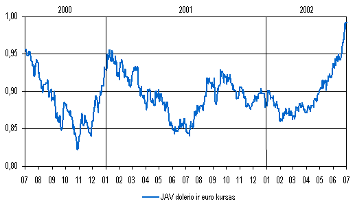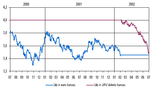 Lito susiejimas su euru Nuo šių metų vasario 2 d. lito kursas yra fiksuotas nebe JAV dolerio, o euro atžvilgiu. Sprendimas susieti litą su euru priimtas atsižvelgus į spartėjančią ekonominę ir politinę šalies integraciją į Europos Sąjungą. Ilgalaikė fiksuoto lito kurso režimo strategija naudojama siekiant įstoti į Europos Sąjungą, o vėliau ir įsijungti į euro zoną. Euro atžvilgiu fiksuota lito kurso sistema bus tinkama Lietuvai, tapus ES nare, prieš euro įvedimą prisijungti prie Valiutų kursų mechanizmoII. Lietuvos bankas, vadovaudamasis bazinės valiutos keitimą apibrėžiančiomis Lito patikimumo įstatymo nuostatomis, šių metų vasario 1 d. baigė įgyvendinti dar 1999 m. spalį pagrindiniais bruožais suformuluotą, o 2001 m. birželio 28 d. valdybos nutarimais Dėl bazinės valiutos ir oficialaus lito kurso nustatymo ir Dėl oficialaus lito kurso apskaičiavimo tiksliai apibrėžtą ir paskelbtą visuomenei lito susiejimo su euru planą. Rengdamas šį planą, Lietuvos bankas konsultavosi su Lietuvos Respublikos Vyriausybe, Europos centriniu banku, Tarptautinių atsiskaitymų banku ir Tarptautiniu valiutos fondu.Oficialus fiksuotas lito kursas euro atžvilgiu (3,4528 lito už 1 eurą) buvo apskaičiuotas, 2002 m. vasario 1 d. ECB paskelbtą JAV dolerio ir euro santykį padauginus iš keturių (t.y. iš iki tol buvusio fiksuoto lito ir JAV dolerio santykio). Lietuvos bankas pasirinko ECB skelbiamą kursą, siekdamas užtikrinti maks imalų kurso parinkimo skaidrumą ir atsižvelgdamas į palankias technines aplinkybes.Lietuvos ekonomikai, pastaraisiais metais įrodžiusiai savo konkurencingumą, euro ir JAV dolerio rinkos kurso svyravimų įtaka nebuvo pavojinga nustatant oficialų lito ir euro kursą. Lito perkamoji galia išliko žymiai nuvertinta ir JAV dolerio, ir euro atžvilgiu. Statistikos departamento prie Lietuvos Respublikos Vyriausybės duomenimis, 1999 m. pagal perkamosios galios paritetą vienas euras kainavo tik 1,654 lito. Kadangi 200 02002 m. infliacija Lietuvoje ir euro zonoje buvo panaši, lito ir euro santykis pagal perkamąją galią taip pat išliko labai panašus, t.y. 2 kartus mažesnis už šių metų vasario 1 d. fiksuotą oficialųjį lito ir euro kursą.Žymus JAV dolerio kurso kritimas euro, taigi ir lito, atžvilgiu šių metų balandžiobirželio mėn. didelės įtakos Lietuvos makroekonomikai neturėjo, nes šalies prekyboje su užsieniu vyrauja euro zonos šalys ir kandidatės į ES, o konkurencijos su jomis sąlygos praktiškai nepakito. Euro ir dol erio kurso svyravimai reikšmingiau nepaveikė ir ūkio dalies, susijusios su žaliavų importu ir eksportu (pirmiausiai energetikos), konkurencingumo, nes pasaulinės žaliavų kainos yra visiems panašios, o jų produktų rinkos yra labai konkurencingos. Į Rusiją eksportuojamų žemės ūkio produktų kainų padidėjimą, litui pabrangus JAV dolerio atžvilgiu, didele dalimi atsvėrė realaus Rusijos rublio kurso padidėjimas.Lito kurso ir euro kurso kaita JAV dolerio atžvilgiu (nuo 2000 m. vidurio iki 2002 m. vidurio)
