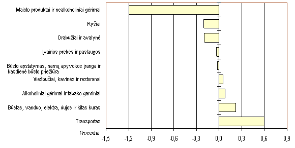 Pirmąjį šių metų pusmetį 5,7 procento padidėjo elektros kaina (vasario mėn.), dėl kai kuriuose šalies rajonuose padidėjusios kainos už centralizuotos šilumos tiekimą 1,3 procento pabrango būsto šildymas, bet 1,8 procento sumažėjo dujų kaina. Dėl šių priežasčių vartotojų kainų indeksas padidėjo 0,2 procento. Metų pradžioje 30 procentų sumažinti tarifai už telefono skambučius į Europos Sąjungos valstybes vartojimo kainas šalyje sumažino taip pat 0,2 procento. Praėjusį pusmetį buvo padidinti akcizai degalams (sausio mėn.) ir tabako gaminiams (balandį). Padidėjus akcizui degalams bei pabrangus žaliai naftai, tačiau sumažėjus JAV dolerio kursui, degalų ir tepalų VKI išaugo 16,3 procento, visas vartotojų kainas padidindamas 0,6 procento. Tabako gaminių kainos, padidėjusios 3,1 procento, visą VKI padidino 0,07 procento. Aptariamuoju laikotarpiu vartotojų kainas labiau veikė vartojimo kainų kaita atvirame užsienio konkurencijai sektoriuje. Dėl geresnio pajėgumų panaudojimo, didėjančio darbo našumo ir konkurencijos minėto sektoriaus prekių ir paslaugų kainos sumažėjo 0,9 procento, o VKI dėl to sumažėjo 1,0 procento. Transporto prekės ir paslaugos per pirmąjį pusmetį pabrango 8,3 procento, vartojimo kainas padidindamos 0,6 procento. Šios grupės kainų didėjimą iššaukė degalų ir tepalų kainų, sudarančių daugiau negu pusę (50,6%) transporto VKI, pokyčiai. Benzino ir kitų degalų kainos didėjo ir dėl išorinių (didėjo pasaulinės naftos kainos), ir dėl vidaus (didėjo akcizai) veiksnių. Lietuvos transporto prekių ir paslaugų VKI priklausomybė nuo pasaulinių naftos kainų (pokytis per metus)