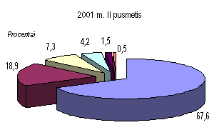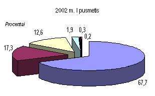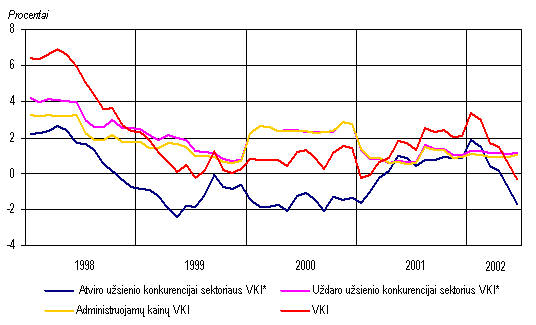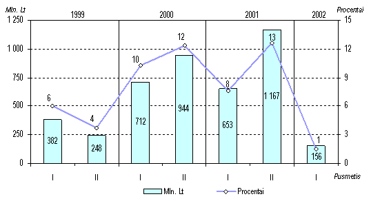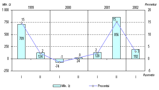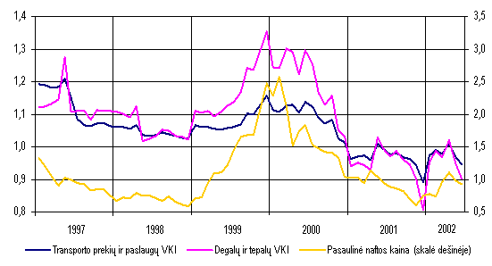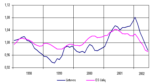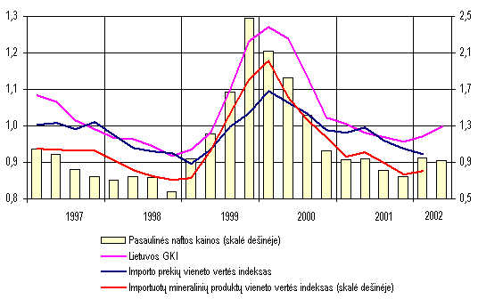 Eksportuotų prekių kainos pirmąjį šių metų ketvirtį sumažėjo 1,7 procento. Labiausiai sumažėjo išvežtų avalynės, maisto produktų, medienos ir jos dirbinių vieneto vertė. Importo prekių kainos per tą patį laikotarpį sumažėjo 2,7 procento. Tą lėmė pigiau importuoti mineraliniai produktai, aval ynė bei lengvieji automobiliai. Be to, importo kainos mažėjo ir dėl dolerio kurso smukimo.Didesnis importo prekių kainų sumažėjimas rodo, kad pagerėjo prekybos su užsieniu sąlygos. Prekybos sąlygų indeksas (eksporto ir importo kainų santykis) nuo 0,98 paskutinį 2001 m. ketvirtį padidėjo iki 1,01 pirmąjį šių metų ketvirtį. Bendrasis vidaus produktas Statistikos departamento prie Lietuvos Respublikos Vyriausybės duomenimis, per pirmąjį 2002 m. pusmetį sukurta 23,9 mlrd. litų vertės (veikusiomis kainomis) bendrojo vidaus produkto (BVP) 1,3 mlrd. litų daugiau negu tuo pačiu praėjusių metų laikotarpiu. Realusis BVP (lyginamosiomis 1995 m. kainomis) padidėjo 5,7 procento. Vienam gyventojui tenkanti bendrojo vidaus produkto dalis pasiekė 6,9 tūkst. litų (tuo pa t metu pernai 6,5 tūkst. Lt).Paslaugų sferoje sukurta 64,4 procento bendrojo vidaus produkto (didmeninėje ir mažmeninėje prekyboje 14,3%, transporto, sandėliavimo ir ryšių paslaugose 12,3%, nekilnojamojo turto, nuomos ir kito verslo veiklose 7,2%, švietimo paslaugose 6,3% ir kt.). Likusi BVP dalis sukurta gamybinėse veiklose: pramonėje 25,4 procento, žemės ūkyje, medžioklėje, miškininkystėje ir žuvininkystėje 5,4, statyboje 4,8 procento. Palyginti su pirmuoju 2001 m. pusmečiu, labiausiai padidėjo realioji pridėtinė vertė, sukurta statybos (13,2%), transporto, sandėliavimo ir ryšių (11,9%), viešbučių ir restoranų (9,8%) veiklose, didmeninėje ir mažmeninėje prekyboje (7,8%), išgaunamojoje pramonėje ir elektros, dujų bei vandens tiekimo veiklo se (po 6,9%). Tačiau BVP prieaugį labiausiai lėmė rezultatai, pasiekti didmeninėje ir mažmeninėje prekyboje (realiąją pridėtinę vertę padidinę 1,4%), transporto, sandėliavimo ir ryšių veiklose (1,2%), apdirbamojoje pramonėje (1%), statyboje (0,6%) ir žemės ūkyje (0,4%).Žymus apimčių didėjimas daugelyje ūkio sričių atspindi atsigaunančią vidaus rinką. Tačiau prekybos apimčių padidėjimą, praėjusį pusmetį turėjusį, kaip minėta, didžiausios įtakos realiosios pridėtinės vertės prieaugiui, didžia dalimi lėmė administracinis sprendimas nuo liepos 1 d. panaikinti pridėtinės vertės mokesčio grąžinimą juridiniams asmenims, įsigyjantiems naujus automobilius. Dėl to antrąjį šių metų ketvirtį prekyba naujais automobiliais ypač padidėjo. Tokie pavieniai ekonominės politi kos veiksmai neleidžia drąsiai prognozuoti didelės teigiamos BVP kaitos ateityje. Džiugina pramonėje, statyboje ir transporto veiklose sukuriamos realiosios pridėtinės vertės didėjimas. Šios sritys mažiausiai priklauso nuo administracinių veiksmų, tačiau jų rodiklių kaitą žymia dalimi lemia padėtis išorės rinkose.Pirmojo šių metų pusmečio BVP, apskaičiuoto išlaidų metodu, struktūroje namų ūkių vartojimo išlaidos sudarė beveik du trečdalius (65,0%). Palyginti su tuo pačiu laikotarpiu pernai, 1,3 karto (lyginamosiomis kainomis) išaugusios bendrosios vidaus investicijos realųjį BVP padidino 7,4 procento. Realiosios namų ūkių vartojimo išlaidos, padidėjusios 6 procentais, bendrąjį vidaus produktą padidino 4,6 procento. Vyriausybės išlaidų padidėjimas 0,3 procen to realųjį BVP padidino 0,1 procento. Visos galutinio vartojimo išlaidos padidėjo 5 procentais.Per pirmuosius šešis šių metų mėnesius, palyginti su tuo pačiu praėjusių metų laikotarpiu, prekių ir paslaugų eksportas lyginamosiomis 1995 m. kainomis išaugo 14,5 procento, o importas 18 procentų. Šis eksporto apimčių prieaugis realųjį BVP padidino 10,2 procento. Dėl minėto importo apimčių prieaugio bendrasis vidaus produktas sumažėjo 16,5 procento. Todėl galima teigti, kad didėjantys eksportas, vidaus vartoj imas ir investicijos tapo veiksniais, skatinančiais spartesnį BVP augimą.Bendrojo vidaus produkto, apskaičiuoto pajamų metodu, struktūroje pelno ir mišriųjų pajamų dalis buvo 37,5 procento, darbo apmokėjimo 31,2, gamybos ir importo mokesčių 12,6 procento. Palyginti su pirmuoju 2001 m. pusmečiu, gamybos ir importo mokesčių suma padidėjo 12,3 procento, pelnas ir mišrios pajamos 10,3, o darbo apmokėjimas apie vieną procentą. Šie veiksniai ir lėmė nominalaus BVP padidėjimą pirmąjį šių metų pusmetį. Pini gai ir finansų sistemaPinigų bazė Šių metų birželio pabaigoje pinigų bazė P0 buvo 4,3 mlrd. litų. Palyginti su 2001 m. pabaiga, ji sumažėjo 0,4 mln. litų. Lietuvos banko išleistų į apyvartą grynųjų pinigų kiekis per pirmąjį šių metų pusmetį padidėjo 227,0 mln. litų (7,0%), o komercinių bankų atsargos litais ir privalomosios atsargos užsienio valiutomis sumažėjo atitinkamai 112,0 mln. (19,2%) ir 115,5 mln. litų (27,7%). Per tą patį praėjusių metų laikotarpį P0 sumažėjo 130,8 mln. litų (3,3%). Pinigų bazė