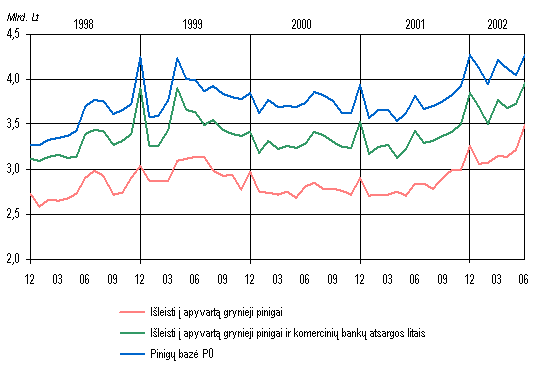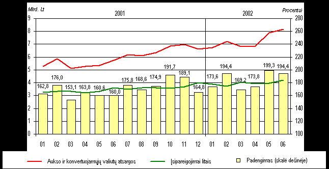 Lietuvos banko įsipareigojimų litais padengimas aukso ir konvertuojamųjų valiutų atsargomis visiškai atitiko Lito patikimumo įstatymo nuostatas. Birželio pabaigoje minėtos atsargos 4,0 mlrd. litų viršijo Lietuvos banko įsipareigojimus litais, o padengimo santykis buvo 194,4 procento (2001 m. pabaigoje atitinkamai 2,6 mlrd. Lt ir 164,8%). Įsipareigojimų litais padengimas padidėjo gegužės mėn., kai į centrinės valdžios sąskaitas Lietuvos banke buvo pervestos lėšos už išplatintą užsienio rinkose 10 metų trukmės 400 mln. eurų vertės euroobligacijų emisiją.