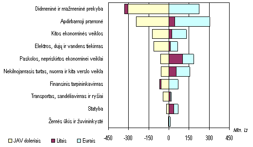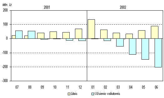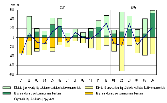 Balandžiobirželio mėn. JAV doleriui susilpnėjus euro (taigi ir lito) atžvilgiu, dalis gyventojų JAV doleriais laikytas santaupas ėmė aktyviau keisti į litus ir, žymiai mažesniu mastu, į eurus. Gegužės mėn. dažniau buvo keičiami grynieji JAV doleriai, o birželį kiek suaktyvėjo ir indėlių keitimas. Bankų duomenimis, indėlininkai daugiausia keitė tik pasibaigusių terminų indėlius. Užsienio valiutų pirkimas ir pardavimas komerciniuose bankuo se 2002 m.(mln. Lt)