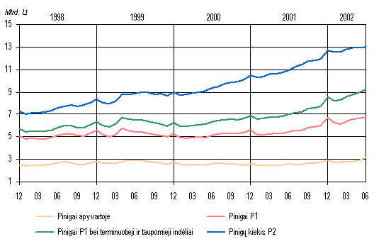 Pinigų kiekis Šių metų birželio pabaigoje pinigų kiekis P2 buvo 13,0 mlrd. litų. Per praėjusį pusmetį jis padidėjo 320,2 mln. litų (2,5%), o per tą patį praėjusių metų laikotarpį 482,2 mln. litų (4,6%). Per pirmąjį šių metų pusmetį pinigų P1 kiekis padidėjo 27,4 mln. litų (0,4%; prieš metus sumažėjo 198,5 mln. litų, t.y. 3,5%). Aptariamuoju laikotarpiu, priešingai ankstesnių metų tendencijoms, pinigai apyvartoje ir fizinių asmenų indėliai iki pareikalavimo litais didėjo sparčiau jie išaugo atitinkamai 288,9 ir 163,5 mln. litų. Tai sietina su padidėjusiu vartojimu sparčiai augant, ypač antrąjį ketvirtį, Lietuvos ūkiui. Ne finansų įmonių indėliai iki pareikalavimo litais praėjusį pusmetį sumažėjo 426,6 mln. litų. Pinigų kiekis