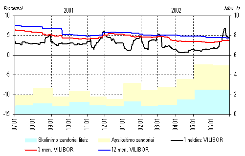 Vidaus rinkoje vyravo litų skolinimo ir apsikeitimo sandoriai. Jų apyvarta pirmąjį šių metų pusmetį buvo 7,5 mlrd. litų (82% visos šios rinkos apyvartos; IIąjį 2001 m. pusmetį 4,8 mlrd. Lt, arba 84%). Sandorių apyvartos didėjimas rodo, kad šalies bankai, valdydami savo likvidumą litais, vis geriau išnaudojo rinkos galimybes, perskirstydami atsargas privalomųjų atsargų reikalavimams įvykdyti. Aktyvus lėšų perskirstymas leido bankams išlaikyti gana stabilias tarpbankinių sandorių palūkanų normas net ir tais atvejais, kai atsargų p erteklius buvo nedidelis.Tarpbankinio skolinimo sandorių litais ir VILIBOR kaita