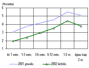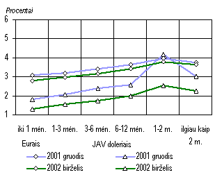 Dėl ECB palūkanų normų didinimo lūkesčių šių metų birželį, palyginti su 2001 m. gruodžiu, kiek padidėjo palūkanų normos už paskolas eurais. Paskolos litais atpigo dėl mažėjančios lito kurso rizikos ir spartaus bankų įsipareigojimų litais dalies didėjimo. Palūkanų normos už trumpalaikes paskolas JAV doleriais taip pat sumažėjo. Paskolų palūkanų normos
