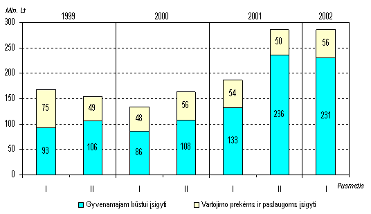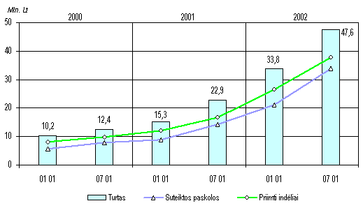 Paskolų prieaugis sausiobirželio mėn. neprilygo praėjusių metų antrojo pusmečio rezultatams, kai paklausą paskoloms smarkiai padidino būstų įsigijimo kreditavimas lengvatinėmis sąlygomis ir pelno mokesčio lengvatų reinvesticijoms panaikinimas. Lėtesniam paskolų portfelio didėjimui nemažai įtakos turėjo euro (iki jo paskelbimo bazine valiuta) ir JAV dolerio (po bazinės valiutos p akeitimo) nuvertėjimas lito atžvilgiu, nes tai sumažino paskolų, suteiktų minėtomis valiutomis, išraišką litais. Tačiau paskolų litais dalis pradėjo didėti tik antrąjį šių metų ketvirtį (per pusmetį ji padidėjo nuo 38% iki 40%), kai fiziniai asmenys ir valdymo institucijos ėmė teikti pirmenybę paskoloms nacionaline valiuta. Įmonės rinkosi paskolas užsienio valiutomis dažniau eurais.Šiais metais tęsiama būstų įsigijimo kreditavimo lengvatinėmis sąlygomis programa. Todėl paskolų fiziniams asmenims portfelis pirmąjį pusmetį padidėjo 16 procentų iki 834 mln. litų. Visame paskolų portfelyje gyventojams suteiktų paskolų dalis padidėjo nuo 11 iki 12 procentų. Paskolų įmonėms padaugėjo 138 mln. litų, o valdymo institucijoms sumažėjo 63 mln. litų. Valdymo institucijoms ir įmonėms suteiktos paskolos birželio pabaigoje sudarė atitinkamai 9 ir 78 procentus viso paskolų portfelio. Fiziniams asmenims per pusmetį suteikta paskolų