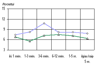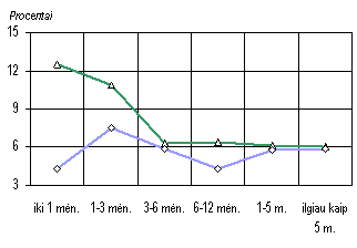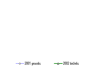 Praėjusį pusmetį toliau mažėjo skirtumas tarp palūkanų normų už paskolas ir indėlius. Ypač sparčiai mažėjo skirtumas tarp paskolų ir indėlių litais ir eurais palūkanų normų. Vyriausybės vertybinių popierių rinka Kaip ir ankstesniais metais, pirmąjį šių metų pusmetį buvo toliau įgyvendinama apyvartoje esančių Vyriausybės vertybinių popierių (VVP) vidutinės trukmės ilginimo strategija. Todėl buvo išleidžiama vis daugiau ilgesnių trukmių Vyriausybės obligacijų. Lietuvos banke organizuotuose aukcionuose vidaus rinkoje pirmą kartą sėkmingai parduotos dešimties metų trukmės Vyriausybės obligacijos, kurių emisija vėliau buvo papildyta iki 57,5 mln. litų. Vidutinė aukcionuose parduotų Vyriausybės vertybinių popierių trukmė padidėjo nuo 630 dienų (praėjusių metų pabaigoje) iki 779 dienų (šių metų birželio pabaigoje). Palyginti su praėjusių metų pirmojo pusmečio pabaiga, šiek tiek pasikeitė apyvartoje esančių VVP struktūra. Šių metų birželio pabaigoje VVP, iki kurių išpirkimo buvo likę daugiau negu vieneri metai, sudarė 57,6 procento visų buvusių apyvartoje VVP (tuo pat metu pernai 46,0%). Pirmąjį šių metų pusmetį VVP apyvartoje padaugėjo 383,9 mln. litų (21,9%), o per tą patį laikotarpį pernai 21,4 mln. litų (1,4%). Šalies komerciniams bankams turint laisvų lėšų, Vyriausybės vertybinių popierių paklausa aukcionuose buvo gana stabili. Praėjusį pusmetį, kaip ir prieš metus, VVP paklausa 2 kartus viršijo jų pasiūlą aukcionuose. Žemos bazinės valiutos euro palūkanų normos, stabili VVP paklausa, teigiamos šalies ūkio raidos tendencijos lėmė VVP pelningumo normų mažėjimą pirminėje rinkoje. Net ir išleidus daugiau ilgesnių trukmių Vyriausybės obligacijų (kurių pelningumas didesnis, negu trumpesnių trukmių VVP), per praėjusį pusmetį Lietuvos banko aukcionuose parduotų visų trukmių VVP vidutinis pelningumas sumažėjo iki 4,8 procento (Iojo 2001 m. pusmečio pabaigoje buvo 7,1%). Vidutinis valstybės iždo vekselių pelningumas sumažėjo iki 4,0 procento (2001 m. birželio pabaigoje buvo 6,3%), o Vyriausybės obligacijų iki 5,5 procento (tuo pat metu pernai buvo 8,0%). Šių metų pavasarį pirmą kartą į vidaus rinką išleistų dešimties metų trukmės valstybės obligacijų vidutinis pelningumas skyrėsi nuo tokios pat trukmės Vokietijos VVP pelningumo mažiau negu vienu procentiniu punktu. Pagal minėtos trukmės VVP pelningumą yra vertinama šalies, siekiančios narystės Europos ekonominėje ir pinigų sąjungoje, pažanga ir Europos bendrijos Mastrichto sutarties kriterijų atitikimas. Šiais metais šiek tiek padidėjo VVP apyvartumas antrinėje rinkoje Nacionalinėje vertybinių popierių biržoje. Per praėjusį pusmetį vidutinė savaitės apyvarta buvo arti 25 mln. litų (prieš metus 23,7 mln. Lt). Siekiant antrinėje rinkoje padidinti VVP likvidumą, yra mažinamas skirtingų emisijų VVP apyvartoje skaičius bei rengiami jau išleistų ilgalaikių VVP emisijų papildymo aukcionai. Aptariamuoju laikotarpiu skirtingų emisijų ilgesnių trukmių VVP kiekis apyvartoje jau pasiekė 110 mln. litų, o emisijų skaičius sumažėjo iki 27 (prieš metus buvo 32). Lietuvos centrinio vertybinių popierių depozitoriumo duomenimis, pagrindiniai investuotojai į Vyriausybės vertybinius popierius, kaip ir anksčiau, buvo šalies komerciniai bankai. Birželio pabaigoje jie turėjo 63,6 procento visų buvusių apyvartoje VVP nominaliąja verte (prieš metus 60,2%). Vienos didžiausių šalies investuotojų grupių draudimo įstaigų (neįskaitant privalomojo soc. draudimo) investicijos vertine išraiška per metus padidėjo, tačiau jų turimų VVP dalis sumažėjo nuo 17,0 iki 16,0 pro cento.Gyventojai į aukcionuose parduotus VVP birželio pabaigoje buvo investavę 6,8 mln. litų (0,3% visų investicijų; prieš metus 183,9 mln. Lt arba 10,9%). Pažymėtina, kad nuo praėjusių metų vidurio padidėjo gyventojų investavimas į taupymo lakštus. Praėjusio pusmečio pabaigoje gyventojai buvo įsigiję 228,0 mln. litų nominaliosios vertės taupymo lakštų (2001 m. birželio pabaigoje 207,6 mln. Lt). Stabili VVP paklausa aukcionuose, rami situacija finansų rinkose, šalies ūkio raida, sumažėjęs VVP pelningumas pirminėje rinkoje sudaro palankias sąlygas ilginti vidutinę Vyriausybės vertybinių popierių trukmę, leidžiant ilgesnių trukmių VVP. Tai mažina skolos refinansavimo riziką, leidžia valstybės skolą efektyviau valdyti ir mažinti jos aptarnavimo kaštus. Pa saulio makroekonominė aplinka ir šalies mokėjimų balansasTrumpa pasaulio makroekonomikos apžvalga Ekonomikos raida Pasaulio ekonomikos plėtra 2001 m. buvo lėčiausia per visą dešimtmetį. Šių metų pradžioje manyta, kad 2000 m. viduryje prasidėjęs pasaulio ekonomikos plėtros lėtėjimas baigėsi. Tačiau pirmąjį šių metų pusmetį ekonomiškai stipriausiuose regionuose ūkio raida buvo kur kas lėtesnė nei tikėtasi. JAV ekonomika sparčiai augo pirmąjį šių metų ketvirtį, tuo tarpu antrąjį ketvirtį jos plėtra sulėtėjo. Didžiausios įtakos tam turėjo namų ūkių vartojimo ir vyriausybės išlaidų augimas bei mažėjančios investicijos. Namų ūkių vartojimo išlaidų didėjimą paskatino nedidelės palūkanų normos, sumažinti asmeninių pajamų mokesčiai ir mokesčių grąžinimas. Vyriausy bės išlaidos didėjo dėl papildomų išlaidų gynybai, sveikatos apsaugai bei kitoms struktūrinėms programoms. Sumažėjusios atsargos, stiprėjanti gamyba bei nedidelės palūkanos skatino įmones didinti investicijas, tačiau dėl mažėjančio įmonių pelno ir kritusios akcijų vertės jos sumažėjo.JAV, euro zonos ir Japonijos BVP pokyčiai 1998-2002 m. (palyginta su tuo pačiu praėjusių metų laikotarpiu)