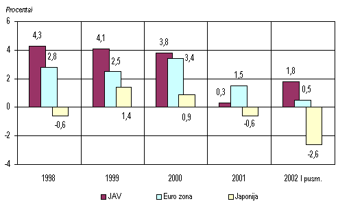 Euro zonos bendrasis vidaus produktas praėjusį pusmetį padidėjo tik 0,5 procento. Svarbiausios jos ūkio raidos sulėtėjimo priežastys buvo sumažėjusios investicijos bei lėčiau didėjančios namų ūkių vartojimo išlaidos. Investicijos ir gamyba mažėjo dėl silpnos namų ūkių paklausos bei sumažėjusių pelningumo rod iklių. Tai sąlygojo atsargų mažėjimą. Ekonomika lėtai augo visose trijose didžiausiose euro zonos valstybėse (Vokietijoje, Prancūzijoje ir Italijoje), taip pat Didžiojoje Britanijoje.Japonijai pirmąjį šių metų pusmetį nepavyko įveikti keletą metų besitęsiančio ekonomikos nuosmukio. Jos BVP aptariamuoju laikotarpiu sumažėjo 2,6 procento. Svarbiausia to priežastis buvo toliau vis mažėjančios investicijos. Tiesa, antrąjį ketvirtį šalies ūkio lėtėjimą pristabdė atsigaunanti gamyba, dėl pagyvėjusios prekybos lėčiau mažėjantis eksportas ir padidėjęs namų ūkių vartojimas. Pirmąjį šių metų pusmetį infliacija JAV buvo 1,1 procento mažiausia per pastaruosius tris dešimtmečius. Euro zonoje infliacija buvo padidėjusi metų pradžioje, vėliau ji žymiai sumažėjo. Tą lėmė pradėjęs stiprėti euras. Japonijoje 1999 m. pradžioje prasidėjusi defliacija tęsėsi ir šiais metais. Gamintojams nepalankus vidaus paklausos ir pasiūlos santykis bei gamybos sąnaudas mažinančios technologijos naujovės buvo svarbiausios priežastys, lėmusio s kainų mažėjimą.Infliacijos pokyčiai JAV, euro zonoje ir Japonijoje 1998-2002 m. (palyginta su tuo pačiu praėjusių metų laikotarpiu)