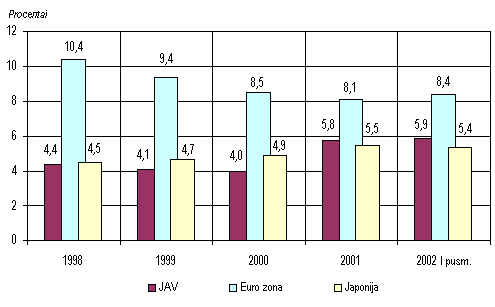 Dėl pavėluotos reakcijos į ciklinius ekonomikos svyravimus nedarbo lygis JAV šių metų pradžioje padidėjo iki 6,0 procento ir buvo didžiausias nuo 1994 m. Lėtai augant euro zonos ekonomikai, nedarbas per praėjusį pusmetį padidėjo 0,3 punkto iki 8,4 procento. Nedarbo lygis didėjo Vokietijoje ir Prancūzijoje, tuo tarpu Italijoje dėl tęsiamos darbo rinkos reformos ir paslaugų sektoriaus plėtros jis buvo mažiausias per pastaruosius devynerius metus. Japonijoje metų pradžioje nedarbas buvo sumažėjęs 0,3 punkto iki 5,2 procento. Tačiau, įmonėms tęsiant restruktūrizaciją ir dėl kaštų mažinimo atleidžiant darbuotojus, pirmojo pusmečio pabaigoje jis vėl išaugo.Nedarbas JAV, euro zonoje ir Japonijoje 1998-2002 m. (laikotarpio pabaigoje)
