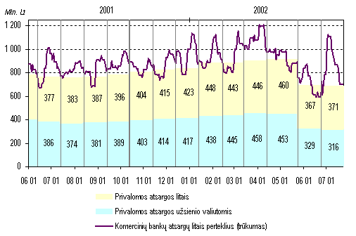 Komercinių bankų įsipareigojimų, kuriems taikomos privalomosios atsargos, padidėjimas šias atsargas padidino 83,3 mln. litų (9,9%), iš jų nacionaline valiuta 74,2 mln. litų (17,5%), o užsienio valiutomis 9,1 mln. litų (2,2%). Įsipareigojimų litais prieaugiui didžiausios įtakos turėjo fizinių asmenų indėliai, išaugę 607,3 mln. litų (22,2%) ir privačių įmonių indėliai, padidėję 260 mln. litų (16,1%). Įsipareigojimai užsienio valiutomis labiausiai padidėjo, privačių įmo nių indėliams išaugus 280,1 mln. litų (27,1%).Privalomųjų atsargų normos sumažinimas ir euro zonos pavyzdžiu įvesta apskaičiuotų privalomųjų atsargų sumažinimo nuolaida (kiekvienam bankui po 345,3 tūkst. Lt) šias atsargas sumažino 235,2 mln. litų (25,5%). Pirmąjį šių metų pusmetį vidutinis atsargų litais perteklius buvo 78,5 mln. litų (18,6% privalomųjų atsargų; Iąjį 2001 m. pusmetį 15,8%, IIąjį 16,4%). Lietuvos banko paskolos Lietuvos bankas mokiems, tačiau turintiems laikinų likvidumo sutrikimų komerciniams bankams gali teikti likvidumo paskolas arba sudaryti su jais tiesioginius Vyriausybės vertybinių popierių atpirkimo sandorius. Tarpbankinių atsiskaitymų stabilumui užtikrinti Lietuvos bankas gali teikti vienos nakties paskolas už įkeistus Vyriau sybės vertybinius popierius. Visoms minėtoms paskoloms taikomos kintančios palūkanų normos.Siekdami apsidrausti nuo nenumatyto trumpalaikio lėšų trūkumo vykdant tarpbankinius atsiskaitymus, šalies bankai, kaip ir anksčiau, buvo pasirengę naudotis vienos nakties paskolomis. Tačiau veiksminga tarpbankinių atsiskaitymų sistema Lietuvos banke ir tarpbankinės rinkos galimybės leido patiems bankams patikimai valdyti likvidumą. Todėl pirmąjį šių metų pusmetį komerciniai bankai nesikreipė į Lietuvos banką dėl vien os nakties ar likvidumo paskolų bei tiesioginių atpirkimo sandorių.Valiutų keitimo operacijos Lietuvos bankas per pirmąjį šių metų pusmetį su savo indėlininkais (daugiausiai su Finansų ministerija) ir šalies komerciniais bankais sudarė 4,6 mlrd. litų vertės užsienio valiutos keitimo sandorių. Sandoriai su komerciniais bankais sudarė 30,8 procento, o indėlininkais 69,2 procento minėtos sumos. Didžiausia valiutų keitimo apyvarta buvo vasario mėn. (1 275,3 mln. Lt), mažiausia balandžio mėn. (516,5 mln. Lt ).Lietuvos bankas iš komercinių bankų nupirko užsienio valiutos už 660,5 mln. litų daugiau, negu jiems pardavė, o indėlininkams pardavė užsienio valiutos už 559,7 mln. litų daugiau negu iš jų pirko. Bendras prekybos rezultatas buvo teigiamas 100,8 mln. litų. Bazinės valiutos pirkimą iš komercinių bankų lėmė Lietuvos dujų privatizavimo metu padidėjusi nacionalinės valiutos paklausa (birželio mėn.). Lietuvos banko indėlininkų atliekamos užsienio valiutos keitimo operacijos buvo susijusios su valstybės biudžeto išlaidomis, Vyriausybės vertybinių popierių išleidimu bei išpirkimu vidaus ir užsienio rinkose, užsienio paskolų grąžinimu ir palūkanų mokėjimu bei laikinai laisvų lėšų investavimu. Grynasis užsienio valiutos pardavimas Lietuvos bankui (mln. Lt)