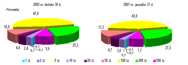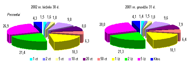 Birželio pabaigoje 1, 2 ir 5 litų monetos, baigiančios pakeisti tų pačių nominalų banknotus, sudarė du trečdalius (66,6 %) visos monetų apyvartoje sumos. Per pusmetį minėtų monetų dalis sumažėjo iš viso 0,8 punkto (1 Lt monetų dalis padidėjo 0,2 punkto, 2 Lt 0,1 pun kto, o 5 Lt monetų dalis sumažėjo 1,1 punkto).