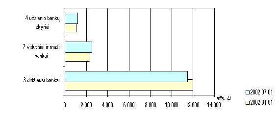 Per praėjusį pusmetį turto koncentracija bankų sistemoje šiek tiek pasikeitė. Didžiausių bankų (Vilniaus banko, HansaLTB ir LŽŪB) valdomo turto dalis sumažėjo nuo 77,9 iki 75,5 procento, o užsienio bankų skyrių turto dalis padidėjo nuo 6,8 iki 7,9 procento. Panašios tendencijos susiklostė suteiktų paskolų ir priimtų indėlių rinkoje. Bankų pasiskirstymas pagal valdomo turto dydį