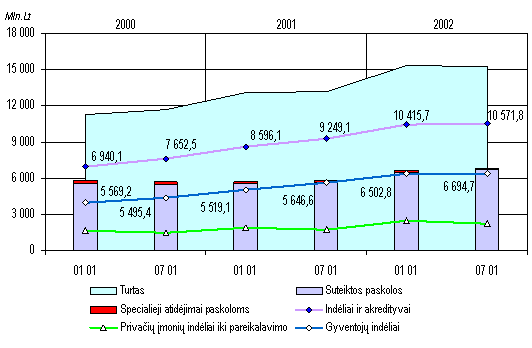 Paskolų teikimas išliko svarbiausia bankų veiklos sritimi. Šių metų liepos 1 d. klientams suteiktos paskolos (grynąja verte) sudarė didžiausią (42,7%) bankų turto dalį. Pastaraisiais metais paskolų portfelyje vis didėjusi ilgalaikių paskolų dalis pasiekė naują aukščiausią lygmenį 69,8 procento. Ilgalaikės paskolos sudaro palankias sąlygas bankų klientams plėtoti investicinius projektus ir augti šalies ūkiui, tačiau padidina bankų kredito riziką, nes per ilgą laikotarpį gali pasikeisti ekonomikos augimo ciklas.Žymų fizinių asmenų kreditavimo suaktyvėjimą lėmė daugelis veiksnių, tarp jų ir gana efektyvi valstybės parama būstui už paskolas įsigyti, padidėjusios bankų galimybės pritraukti piniginių išteklių ilgalaikiams projektams finansuoti, dėl augančios konkurencijos tarp bankų sumažėjusios palūkanų normos ir pagerėjusios paskolų suteikimo sąlygos. Fiziniams asmenims suteiktų ilgalaikių paskolų (tarp kurių vyravo būstų įsigijimo kreditavimo paskolos) suma, per pusmetį padidėjusi 18,3 procento ir sudariusi apie 17 procentų bankų suteiktų visų ilgalaikių paskolų, pastaruoju metu tapo vienu iš sparčiausiai augančių bankų turto straipsnių. Šiuo metu bankų paskolų portfelio kokybės rodikliai yra geriausi per keletą pastarųjų metų. Specialiųjų atidėjimų paskoloms santykis su visu paskolų portfeliu per pirmąjį šių metų pusmetį sumažėjo nuo 2,5 iki 2,0 procento, o neveiksnių paskolų dalis minėtame portfelyje sumažėjo nuo 7, 5 iki 6,4 procento. Be to, bankų sistemos paskolų portfelyje jau daugiau kaip metus stebimas geriausios kokybės (standartinių) paskolų dalies augimas. Paskolų portfelio kokybės gerėjimą iš dalies lemia ir tai, kad, didėjant privataus sektoriaus įmonių ir gyventojų ekonominiam aktyvumui, suteikiama nemažai naujų ilgalaikių paskolų, kurių kokybės rodikliai ateityje gali keistis. Minėtą kokybę teigiamai veikia ir pagerėjusi kai kurių skolininkų finansinė būklė, taip pat periodiškas nuostolingų paskolų nurašymas ir perkėlimas į nesisteminę apskaitą.Bankų įsipareigojimų struktūra liudija, kad kaip ir anksčiau, didžiausia jų dalis yra indėliai ir akredityvai. Pastarojo pusmečio indėlių augimą, kaip jau minėta, pristabdė JAV dolerio kurso kritimas, nes vis dar nemaža indėlių dalis laikoma užsienio valiutomis. Nors tokių indėlių apimtis per pirmuosius šešis šių metų mėnesius sumažėjo 7,9 procento, liepos 1 d. visuose indėliuose jų buvo 40,9 procento. Indėlių litais suma per pusmetį padidėjo 9,2 procento. Persiejus l itą prie euro, bankų balanse mažėja dalis straipsnių, išreikštų JAV doleriais, bet didėja eurais ir litais nominuotų turto bei įsipareigojimų dalys.Bankų pajamų ir išlaidų struktūra pirmąjį 2002 m. pusmetį