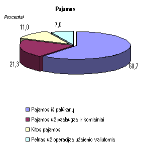Pastaruoju metu nusistovėjusi palūkanų normų mažėjimo tendencija Lietuvos rinkoje sąlygojo palūkanų maržos sumažėjimą ir neigiamai veikė grynųjų pajamų iš palūkanų augimą. Todėl, nors prieš metus susiklosčiusi pajamų struktūra pakito nežymiai, ryškiausiai pastebima pajamų iš palūkanų dalies mažėjimo tendencija. Nepaisant paskolų portfelio augimo, dėl mažų palūkanų normų šalies rinkoje per metus sumažėjo ne tik pajamų iš palūkanų dalis (metų pradžioje ji siekė 66,2%, o liepos 1 d. 60,7% visų pajamų), bet ir šios pajamos absoliučia išraiška. Pajamos už paslaugas ir komisiniai praėjusį pusmetį sudarė 21,3 procento visų pajamų. Daugiau pelno (7% visų pajamų) bankai uždirbo iš operacijų užsienio valiutomis, nes, pasikeitus bazinei valiutai ir sparčiai krentant JAV dolerio kursui, klientai dažniau naudojosi bankų paslaugomis, keisdami santaupų, paskolų bei atsiskaitymų valiutas.Kaip rodo pasikeitimai bankų išlaidų struktūroje, praėjusį pusmetį mažėjo ne tik pajamos iš palūkanų buvo pastebima ir išlaidų palūkanoms dalies mažėjimo tendencija, nes dėl skolinamųjų lėšų pertekliaus rinkoje nuolat pigo bankų pritraukiami ištekliai. Išlaidų palūkanoms dalis visose išlaidose per pusmetį sumažėjo nuo 3 0,1 iki 25,9 procento. Didžiausią bankų išlaidų dalį 46,5 procento sudarė operacinės išlaidos.Pirmąjį šių metų pusmetį septyni bankai ir du užsienio bankų skyriai dirbo pelningai ir gavo iš viso 100,3 mln. litų pelno, o trys bankai (Lietuvos žemės ūkio bankas, Sampo bankas, VB būsto kreditų ir obligacijų bankas) ir du užsienio bankų skyriai patyrė iš viso 17,4 mln. litų nuostolių. Bendras bankų sistemos praėjusio pusmečio veiklos rezultatas 82,9 mln. litų pelno. Palyginimui: pirmąjį praėjusių metų pu smetį bankų sistema uždirbo 63,1 mln. litų pelno, o per 2001 m patyrė 22,5 mln. litų nuostolių.Kredito unijos. Šių metų liepos 1 d. veikusios 47 kredito unijos vienijo daugiau kaip 15 tūkst. narių trečdaliu daugiau negu metų pradžioje. Kredito unijų veiklos praėjusį pusmetį rodikliai liudija sparčią jų veiklos raidą ir nuolat didėjantį narių skaičių. Liepos 1 d. kredito unijų valdomas turtas, per pusmetį padidėjęs 1,4 karto, pasiekė 47,6 mln. litų ir sudarė 0,3 procento bankų sistemos turto. Suteiktų paskolų apimtis išaugo 1,6 karto iki 33,8 mln. litų, priimtų indėlių suma 1,4 karto iki 37,8 mln. litų. Pajinis kapitalas taip pat padidėjo 1,4 karto ir pasiekė 5,6 mln. litų. Pastaruoju metu daugėjo kredito unijų, kurių turtas viršijo 1 mln. litų. Birželio pabaigoje buvo jau 5 kredito unijos, kurių turtas siekė 25 mln. litų. Kredito unijoms plečiant savo veiklą, koncentracijos lygis šiek tiek sumažėjo. Liepos 1 d. 10 didžiausių unijų valdė 55,2 procento viso kredito unijų turto (metų pradžioje 58,2%). Arti trečdalio (28,7%) viso turto valdė trys didžiausios Ūkininkų viltis, Pakruojo ūkininkų ir Šilutės kredito unijos. Kredito unijos plėtė kreditavimo veiklą. Suteiktų paskolų dalis, metų pradžioje sudariusi 62 procentus turto, per pusmetį padidėjo iki 71 procento. Specialiuosius atidėjimus paskoloms buvo sudariusios 25 kredito unijos. Šių atidėjimų suma per praėjusį pusmetį padidėjo 1,9 karto, tačiau, palyginti su visu paskolų portfeliu, specialiųjų atidėjimų dalis buvo nedidelė (0,9%). Apie 5 procentus viso turto sudarė kredito unijų investicijos į VVP, kurios per praėjusį pusmetį padidėjo 15 procentų. Dar 18 procentų lėšų buvo laikoma bankų sąskaitose ir kitose kredito unijose. Kredito unijų įsipareigojimų struktūroje didesnių pakitimų nebuvo. Kaip ir anksčiau, didžiausią įsipareigojimų dalį (91%) sudarė indėliai. Kredito unijų pagrindiniai rodikliai