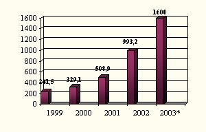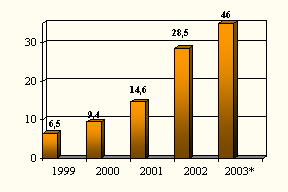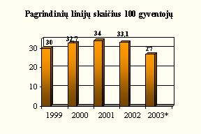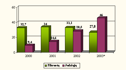 6 pav. Fiksuoto ir judriojo telefono ryšio abonentų skaičiaus palyginimas 100 gyventojų * - RRT prognozuojami 2003 m. sausio 1 d. duomenys. 2002 m. patvirtintos Bendrojo judriojo telefono ryšio paslaugų teikimo taisyklės, nustatančios paslaugų teikėjų (judriojo ryšio operatorių) ir šių paslaugų gavėjų santykius, jų teises ir pareigas. Pagrindinės šių taisyklių nuostatos paslaugų gavėjų teisių apsauga, diskriminavimo prielaidų pašalinimas. Prieš sudarydamas sutartį, teikėjas įpareigotas išsamiau informuoti būsimą paslaugų gavėją apie judriojo telefono ryšio paslaugų ypatybes. Taisyklėse apibrėžtos sutarčių nutraukimo sąlygos ypač pabrėžtinas terminuotų sutarčių nutraukimas telekomunikacijų paslaugų gavėjo iniciatyva.2.3. Duomenų perdavimas Viena iš svarbiausių telekomunikacijų rinkų duomenų perdavimo paslaugos, tarp jų ir interneto paslaugos. Duomenų perdavimo veiklai išduoti 74 leidimai (licencijos). 2002 m. Ryšių reguliavimo tarnyba išdavė 50 leidimų steigti, eksploatuoti duomenų perdavimo tinklus bei teikti duomenų perdavimo paslaugas. Informaciją apie teikiamų paslaugų apimtis, teritoriją, naudojamas technologijas duomenų perdavimo paslaugų teikėjai pateikia RRT kiekvienų metų I ketvirtį. Interneto paslaugų vartotojų skaičius sparčiai auga, diegiamos naujos paslaugos (interneto telefonija ir kt.) ir prisijungimo prie interneto technologijos, pvz. xDSL, kurios suteikia galimybę naudotis didesnės spartos interneto ryšiu per įprastas telefono linijas (metų pabai goje AB Lietuvos telekomas įrengė apie 20000 ADSL įvadų).Plačiajuosčiai bevielio ryšio tinklai alternatyva esamiems laidiniams telekomunikacijų tinklams teikti tiek duomenų perdavimo, tiek balso telefonijos paslaugas. Šią technologiją galima plėtoti atskirai nuo laidinės infrastruktūros. Ryšių reguliavimo tarnyba, išnagrinėjusi operatorių pateiktas pastabas ir pasiūlymus dėl licencijų steigti ir eksploatuoti bendruosius plačiajuosčius bevielio ryšio tinklus 10,5 GHz, 26 GHz bei 3,5 GHz dažnių diapazonu ose išdavimo, parengė konkurso licencijoms gauti nuostatų bei licencijų projektus. Pagal šiuos projektus 2002 m. spalio mėn. Susisiekimo ministerija išdavė licencijas šešioms įmonėms teikti plačiajuosčio bevielio ryšio paslaugas 26 GHz dažnių diapazone , dviems įmonėms 10,5 GHz dažnių diapazone .2.4. Telekomunikacijų rinkų tyrimas Ryšių reguliavimo tarnyba 2002 m. atliko Lietuvos telekomunikacijų sektoriaus tyrimą. Šio tyrimo tikslas - įvardinti ūkio subjektus, turinčius didelę įtaką atitinkamose telekomunikacijų rinkose. Atitinkamų telekomunikacijų rinkų tyrimas buvo atliekamas, vadovaujantis bendros Ryšių reguliavimo tarnybos ir Konkurencijos tarybos darbo grupės patvirtinta Rinkos tyrimo metodika. Tirtos šios rinkos: