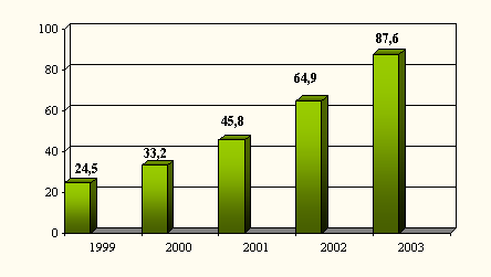 4 pav. Abonentų skaičiaus 5 pav. Judriojo telefono ryšiokitimas tūkst. (sausio 1 d.) abonentų skaičius 100 gyv. (sausio 1d.) * - RRT prognozuojami 2003 m. sausio 1 d. duomenys. Pažymėtina, kad judriojo telefono ryšio skvarba 2002 m. pralenkė fiksuoto telefono ryšio skvarbą (žr. 6 pav).