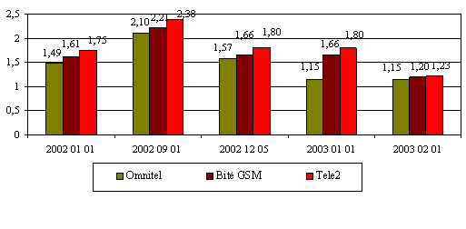 2.5. Tinklų sujungimas 2002 m. patvirtinti Telekomunikacijų tinklų sujungimo privalomieji reikalavimai ir bendrosios telekomunikacijų tinklų sujungimo sutarčių sąlygos nustato principus ir nuostatas, kuriais privalo vadovautis telekomunikacijų operatoriai savo veikloje bei užtikrina lygias galimybes sudaryti sutartis dėl telekomunikacijų tinklų sujungimo. Iki 2003 m. sausio 1 d. tiek AB Lietuvos telekomas, tiek judriojo telefono ryšio operatorių taikyti tinklų sujungimo tarifai (kituose telefono ryšio tinkluose inicijuotų skambučių užbaigimo savame tinkle tarifai) buvo vieni iš didžiausių, palyginus su kitų ES šalių kandidačių analogiškais tinklų sujungimo tarifais. Pastebima tinklų sujungimo tarifų mažėjimo tendencija, atsiradusi su tinklų sujungimo sutarčių tarp telefono ryšio tinklų operatorių pakeitimu, kurį sąlygojo AB Lietuvos telekomas nustatytų įpareigojimų įgyvendinimas (AB Lietuvos telekomas tinklų sujungimo tarifas 2002 metais sumažėjo nuo 0,26 Lt/min iki 0,21 Lt/min.) ir bendra situacija telekomunikacijų rinkoje. Viešųjų judriojo telefono ryšio tinklų operatoriams (UAB Omnitel ir UAB Bitė GSM) sumažinus skambučių užbaigimo tarifus, 2003 m. sausio 2 d. tinklų sujungimo (iš fiksuotojo į judrujį) tarifai, lyginant su analogiškais ES šalių tarifais, vis dar išlieka pakankamai aukšti ir vidutiniškai yra 24,23 ct. 2003 m. vasario 1 d. įsigaliojus naujiems UAB Tele2 skambučių užbaigimo tarifams, vidutinis tinklų sujungimo tarifas, užbaigiant skambučius viešuosiuose judriojo ryšio tinkluose, buvo jau 19,50 ct. Pažymėtina, kad 2003 metų pradžioje įvykę tarifų pokyčiai yra 2002 metais vykusių procesų (kuriuose dalyvavo ne tik telekomunikacijų rinkos dalyviai, bet ir Ryšių reguliavimo tarnyba) rezultatas.