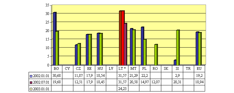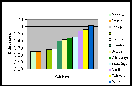 25 pav. parodyta palyginamoji tarifų lentelė, parengta remiantis Olandijos pateiktais Europos Sąjungos šalių narių tarifais, taikomais laiškams ik i 20 g, o taip pat Lietuvos, Estijos, Latvijos ir Lenkijos paštų duomenimis.Kadangi Ryšių reguliavimo tarnyba įgaliota prižiūrėti, kaip laikomasi leidimų teikti pašto paslaugas sąlygų, sukurta pašto ir pasiuntinių pašto paslaugų teikėjų duomenų bazė, kuri yra nuolat atnaujinama, remiantis periodiškai atliekamais pašto ir pasiuntinių pašto paslaugų rinkos stebėjimais (renkama pašto ir pasiuntinių pašto paslaugų teikėjų apie save pateikiama informacija laikraščiuose, int ernete, stebima siunčiama korespondencija ir pan.).Ataskaitiniais metais buvo parengta pašto paslaugų teikėjo anketa, kuri išsiųsta pašto paslaugas teikiančioms ir leidimus turinčioms įmonėms. Šiose anketose surinkta informacija 2003 metais padės papildyti jau turimus duomenis apie pašto paslaugų teikėjus, surinkti informaciją apie pašto paslaugų rinką, jos dydį, pagrindinius rinkos dalyvius. RRT įsitraukė į Europos pašto reguliavimo komiteto CERP (European Committee for Postal Regulation) veiklą, bendradarbiavo ir keitėsi informacija su pašto reguliavimo institucijomis Latvijoje ir Estijoje, Pasauline pašto sąjunga (Universal Postal Union), Regionine ryšių sandrauga (Regional Commonwealth for Communications), Europos pašto universaliųjų paslaugų teikėjų asociacija (Posteurop). Glaudūs ryšiai nusistovėjo su didžiausia Europoje ir ypač daug patirties pašto rinkos reguliavime turinčia institucija Vokietijos RegTP (The Regulatory Authority for Telecommunications and Post). RegTP atstovai pagal TRANSFORM programą surengė tris seminarus pašto rinkos reguliavimo klausimais, konsultavo ir dalinosi patirtimi su RRT darbuotojais, taip pat aprūpino teisine ir metodine medžiaga. RRT darbuotojai dalyvavo CERP surengtuose plenariniuose susitikimuose, kurie vyko Kipre ir Bulgarijoje, taip pat CEPT (Pašto ir telekomunikacijų administracijų Europos konferencija) ir RRS (Regioninė ryšių sandrauga) pasitarimuose Latvijoje ir Azerbaidžane. Buvo nagrinėjamos temos Išlaidų apskaitos sistemos besivystančioms šalims ir pašto reforma, Galutinio atsiskaitymo tarp pašto administracijų sistema ir Techninis išvystymas ir naujų technologijų diegimas pašte. Pasaulinės pašto sąjungos organizuotoje konferencijoje Ženevoje, kurioje buvo svarstomi pasiruošimo sekančiais metais vyksiančiam Kongresui klausimai, dalyvavo Lietuvos delegacija iš Susisiekimo ministerijos, RRT ir VĮ Lietuvos paštas atstovų.