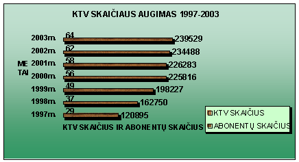 3.1. Radijas ir televizija 2002 m. didelis dėmesys buvo skirtas radijo dažnių skyrimą ir naudojimą radijo ir televizijos programoms transliuoti ir siųsti reglamentuojančių teisės aktų rengimui. Kartu su Lietuvos radijo ir televizijos komisija parengta Radijo dažnių skyrimo radijo ir televizijos programoms transliuoti ir siųsti strategija ir pateikta Lietuvos Respublikos Vyriausybei tvirtinti. Parengtos ir direktoriaus įsakymu patvirtintos Radijo dažnių (kanalų) skyrimo ir naudojimo taisyklės bei Telev izijos ir radijo stočių įrengimo ir naudojimo taisyklės. Rengiamas ir derinamas su suinteresuotomis organizacijomis Radijo dažnių (kanalų) skyrimo radijo ir televizijos programoms transliuoti ir siųsti strateginis planas.Nemažesnis dėmesys buvo skiriamas radijo ir televizijos transliavimo tinklų plėtrai. Iš esmės baigti formuoti tinklai Lietuvos nacionalinio radijo I ir II bei Lietuvos televizijos I programai transliuoti (žr. pav. 1 1, 12, 13). Nors skaičiuojant pagal nustatytas metodikas šiais tinklais transliuojamas programas patikimai gali priimti 90-98 proc. Lietuvos gyventojų, gana geros kokybės minėtais tinklais transliuojamos programos gali būti priimamos visoje Lietuvos teritorijoje. Pradėjus papildomai transliuoti Lietuvos TV I programą 53 TV kanalu Vilniuje, žymiai pagerėjo šios programos priėmimo sąlygos. Iki tol miesto gyventojai skundėsi, kad dėl atspindžių tam tikrose Vilniaus vietovėse praktiškai buvo neįmanoma priimti 2 TV kanalu transliuojamos programos. Baigtas koordinuoti su užsienio valstybėmis naujas 56 TV kanalas, kuriuo jau artimiausiu metu bus pradėta transliuoti dar viena nauja TV programa Vilniaus mieste.Televizijos programų priėmimo sąlygos pagerintos ir kitose Lietuvos vietovėse. Šiaulių televizija pradėjo transliuoti nauju 55 TV kanalu. Šios stoties galią padidinus iki projektinės, transliuojamas programas galės žiūrėti ne tik Šiaulių, bet ir aplinkinių rajonų gyventojai. Plungėje pradėjus transliuoti Lietuvos TV I programą 24 TV kanalu, žymiai pagerėjo šios programos priėmimo są lygos Plungės mieste ir apylinkėse. Iki to laiko Plungės rajono gyventojai televizijos programas priimdavo iš Klaipėdos, todėl signalo stipris Plungėje nebuvo pakankamas, kad būtų užtikrinta gera programų kokybė. Jeigu programų transliuotojai pageidautų, Ryšių reguliavimo tarnyba sukoordinuotų su užsienio šalių administracijomis TV kanalus ir kitoms programoms transliuoti Plungės mieste.Lietuvos nacionalinio radijo ir televizijos prašymu parinkti ir pradėti koordinuoti su užsienio šalių administracijomis radijo dažniai, kurių pagrindu bus galima suformuoti transliavimo tinklus IV nacionalinei radijo programai ir II nacionalinei televizijos programai. Šioms programoms transliuoti numatyta sukoordinuoti dažnius ir parengti technines sąlygas 12 radijo ir 8 T V stotims, išsidėsčiusioms visoje Lietuvoje.Nepaisant to, kad didžioji dalis naujai suplanuotų radijo dažnių buvo numatyti minėtiems nacionaliniams tinklams formuoti ir esamų tinklų plėtrai, per 2002 metus Lietuvos radijo ir televizijos komisijai, kuri skelbia konkursus transliavimo licencijoms gauti, buvo perduoti iš naujo sukoordinuoti radijo dažniai 13 radijo stočių ir 1 TV stočiai. Metų pabaigoje Lietuvoje transliavo 105 TV ir 176 radijo stotys. Dalis šių stočių transliavo vietines ir regionines programas, kitos stotys sudarė 14 nacionalinių radijo ir televizijos transliavimo tinklų, kurių transliuojamas programas gali priimti didelė Lietuvos gyventojų dalis (žr. 14 ir 15pav.). Reikia pažymėti, kad 14 ir 15 pav. pateikti duomenys gauti skaičiuojant t eorines radijo ir televizijos stočių aprėpties zonas, kurios dažnai yra mažesnės nei realios stočių aprėpties zonos. Teorinės stočių aprėpties zonos skaičiavimas pagal Tarptautinės telekomunikacijų sąjungos (ITU) patvirtintą metodiką parodė, kad į aprėpties zoną patenka tik ta teritorija, kurioje programos priėmimo sąlygos ilgesnį laiką yra labai geros. Realiai stočių aprėpties zonai didelės įtakos turi naudojama anteninė įranga, stiprintuvai, radijo ir televizijos imtuvai. Tiksliausiai aprėpties zonos nustatomos matavimais, atliekant juos daug kartų ir skirtingais metų laikotarpiais.2002 metais toliau plėtėsi kabelinės TV tinklai metų pabaigoje veikė 63 kabelinės TV tinklai ir 3 mikrobangės daugiakanalės televizijos tinklai.