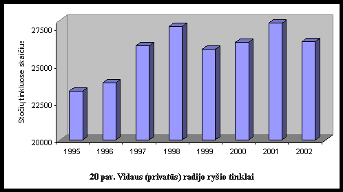 20 pav. pateiktas registruotų sausumos judriosios tarnybos vidaus (privačių) tinklų skaičiaus kitimas per paskutiniuosius septynerius metus. Per praėjusius metus šiuose tinkluose naudojamų stočių skaičius sumažėjo daugiau kaip 1000. Tai susiję su 2002 metų liepą įsigaliojusiu draudimu naudoti nesertifikuotus radijo ryšio įrenginius.