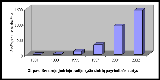 21 pav. pateiktas bendrųjų radijo ryšio tinklų pagrindinių (bazinių) stočių skaičiaus kitimas per 11 metų. 2002 metais bendrųjų radijo ryšio tinklų operatoriai papildomai pastatė 510 pagrindinių stočių, trečdaliu padidindami jų bendrą skaičių ir tuo žymiai pagerindami tinklų teritorijos padengimo rodiklius.