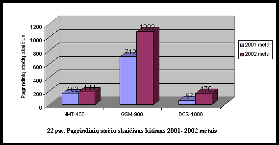22 pav. pateiktas bendrųjų radijo ryšio tinklų pagrindinių (bazinių) stočių skaičiaus kitimas 2002 metais. Lyginant su 2001 metais, galima pastebėti, kad DCS-1800 pagrindinių stočių skaičius išaugo 3 kartus, o užimama dalis tarp kitų stočių tipų išaugo nuo 6 iki 12 procentų.