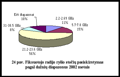 Lietuvoje fiksuotajam radijo ryšiui naudojami radijo dažniai iki 38.5 GHz. RRL stočių pasiskirstymas pagal radijo dažnių diapazonus pateiktas 24 pav.