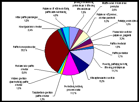 26 pav. VĮ Lietuvos paštas pajamų struktūra 2002 metais Kiti stambūs pašto bei pasiuntinių pašto paslaugų teikėjai UAB DHL International Lietuva , UAB TNT, UAB Skubios siuntos, UAB Baltic Logistic System Vilnius, UAB Bijusta.Ryšių reguliavimo tarnyboje per 2002 m. gauta ir atsakyta į 12 pašto paslaugų naudotojų skundų ir paklausimų. Daugiausiai buvo kreiptasi dėl pašto siuntų apgadinimo ar dingimo - 5 skundai ir dėl pašto paslaugų kokybės 3 skundai. Išnagrinėjus gautus skundus, 5 atvejais išaiškėjo, kad pretenzijos yra pagrįstos ir prašymai buvo patenkinti, likę 7 skundai pripažinti nepagrįstais. VĮ Lietuvos paštas duomenimis, Lietuvoje prarastos 5 pašto siuntos ir išmokėtas žalos atlyginimas sudarė 768,30 Lt, kitose šalyse prarastos 255 pašto siuntos, už kurias žalai atlyginti siuntėjams buvo išmokėta 17778,26 Lt. Kitų pašto ir pasiuntinių pašto paslaugų teikėjų duomenimis, per 2002 metus buvo gauta 310 skundų, išmokėta kompensacijų 5075 Lt.