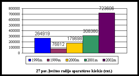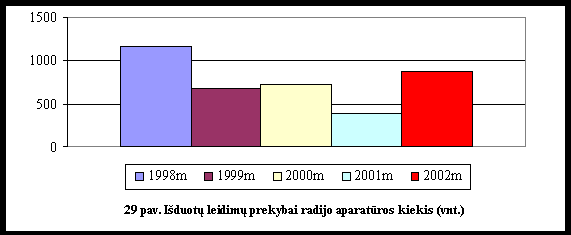 V. APARATŪROS IR ĮRENGINIŲ KONTROLĖ 5.1. Radijo ryšio įrenginių rinkos priežiūra 2002 metais RRT atliko prekybos radijo ryšio aparatūra ir įrenginiais vietų, radijo ryšio tinklų priežiūrą, kontroliavo radioelektroninės aparatūros ir įrenginių įvežimą į Lietuvos Respubliką. Buvo išduoti leidimai ją įvežti, prekiauti ir naudoti, taip pat išduoti sertifikavimo žymenys. Tarnybos inspektoriai surašė 26 administracinių teisės pažeidimų protokolus. Bendradarbiaujant su policija, konfiskuoti 3 vnt. neteisėtai naudotos aparatūros. Išduoti 199 sutikimai aparatūrai ir įrenginiams išvežti iš Lietuvos Respublikos teritorijos, 877 leidimai prekiauti radioelektronine aparatūra ir įrenginiais, 2320 leidimai įvežti radioelektroninę aparatūrą ir įrenginius. RRT duomenimis, iš viso įvežta 723606 vnt. radioelektroninės aparatūros ir įrenginių. 2002 m. išduoti 736955 sertifikavimo žymenys, patikrinti 32 veikiantys radijo ryšio tinklai ir 205 įmonės, prekiaujančios radioelektronine aparatūra ir įrenginiais. Prekybos radijo ryšio aparatūra ir įrenginiais vietų, radijo ryšio tinklų priežiūrą taip pat vykdė Radijo kontrolės skyriai, esantys Kaune, Klaipėdoje, Panevėžyje ir Šiauliuose.