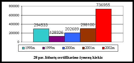 10 pav. Tinklų sujungimo tarifai, užbaigiant skambučius viešuosiuose judriojo telefono ryšio tinkluose, kai skambučiai pradėti viešajame fiksuoto telefono ryšio tinkle, 2002-01-01 ir 2002-06-30, ct (* vidutinis tarifas). 2.6. Numeracijos planas 2002 metais buvo toliau diegiamas Nacionalinis telefono ryšio numeracijos planas. Pakeista fiksuoto telefono ryšio numeracijos sistema bei įvestas naujasis tarptautinis prefiksas 00. Keičiant numeraciją, buvo siekiama užtikrinti, kad kuo mažiau keistųsi abonentų numeriai. Bendromis RRT ir telekomunikacijų operatorių pastangomis būtini darbai atlikti laiku, pavyko išvengti vartotojų nusiskundimų. Nacionalinis telefono ryšio numeracijos planas atitinka Europos Sąjungos reikalavimus dėl tarptautinio prefikso 00, bendrojo pagalbos tarnybų iškvietimo numerio 112 ir informacinių tarnybų numerio 118. Be to, įvesti nemokamo skambučio 800XXXXX, padidinto tarifo 90XXXXXX ir personaliniai 700XXXXX numeriai, naudojami tiek daugelyje Europos Sąjungos, tiek ir kitų pasaulio šalių. Nacionalinio telefono ryšio numeracijos plano įgyvendinimas yra būtina prielaida užtikrinti konkurenciją telekomunikacijų sektoriuje, sudaryti paslaugų teikėjo pasirinkimo bei abonento numerio perkeliamumo įgyvendinimo galimybes. Esant paslaugos teikėjo pasirinkimo (carrier selection) galimybei, vartotojai galės rinktis kokybės ir kainos požiūriu priimtiną paslaugos teikėją. 2.7. Rinkos priežiūra 2002 metais Ryšių reguliavimo tarnyba didelį dėmesį skyrė telekomunikacijų rinkos priežiūrai. Spręsdama ginčus bei surašydama Administracinius teisės pažeidimų protokolus, RRT vadovavosi papildytu Administraciniu teisės pažeidimų kodeksu , Telekomunikacijų įstatymu, taip pat RRT Tarybos nutarimu patvirtinta Ginčų, kilusių tarp telekomunikacijų operatorių, nagrinėjimo tvarka. AB Lietuvos telekomas 2001 m. informavo kabelinės televizijos operatorius, kurie naudojasi AB Lietuvos telekomas telekomunikacijų infrastruktūra, kad nuo 2002 m. sausio 1 d. keičiasi telefonines kanalizacijos nuomos įkainiai. Kabelinės televizijos operatoriai pateikė skundus Ryšių reguliavimo tarnybai, nurodydami, kad naujieji telefoninės kanalizacijos nuomos įkainiai nėra ekonomiškai pagrįsti. Ryšių reguliavimo tarnyba priėmė sprendimą patenkinti UAB Lignita, UAB Telerena, UAB Parabolė, UAB Televizijos komunikacijos, V.Veizbono firmos Orbita, UAB Roventa, UAB Elekta, UAB Kabeliniai ryšių tinklai, UAB Trigeris, UAB Satela, UAB Kateka, UAB Funaris skundus dėl užmokesčio už naudojimąsi telekomunikacijų įrenginiais. Pripažinta, kad telefoninės kanalizacijos nuomos įkainių padidinimas yra nepagrįstas. Vilniaus apygardos administracinis teismas ir Lietuvos vyriausiasis administracinis teismas atmetė AB Lietuvos telekomas apeliacinius skundus ir paliko galioti Ryšių reguliavimo tarnybos sprendimą. RRT nustatė, kad paslaugų teikėjas negali apmokestinti pokalbių, trumpesnių negu telefoninių pokalbių laiko apskaitos sistemos pokalbių fiksavimo paklaidos norma, patvirtinta Lietuvos Respublikos Vyriausybės įgaliotos institucijos. 2002 metų pradžioje pokalbių laiko apskaitos sistemos paklaidos norma buvo 5 sekundės, kurią nustatė Metrologijos tarnyba. Vilniaus m. 2 apylinkės teisme išnagrinėtos administracinės bylos dėl RRT nutarimų skirti AB Lietuvos telekomas generaliniam direktoriui baudas pagal Lietuvos Respublikos administracinių teisės pažeidimų kodekso 1534 straipsnį dėl atsisakymo Ryšių reguliavimo tarnybai pateikti informaciją, pagrindžiančią pokalbių taksofonu kainos didinimą, bei dėl telekomunikacijų paslaugų teikimo kaimų paštuose nutraukimo, apie tai neinformavus RRT, ir reikalavimo atnaujinti paslaugų teikimą nevykdymo. Teismo nutarimu, AB Lietuvos telekomas generaliniam direktoriui už licencijos sąlygų pažeidimą abiem atvejais skirtos 375 Lt baudos. Pagal RRT inspektorių AB Lietuvos telekomas vadovui surašytą Administracinio teisės pažeidimo protokolą dėl neteisėto skambučių iš fiksuotojo tinklo į judriojo telefono ryšio tinklus kainų padidinimo, pažeidžiant Lietuvos Respublikos Vyriausybės 2001 m. gruodžio 06 d. nutarimą Nr. 1478 Dėl bendrojo fiksuoto telefono ryšio paslaugų didžiausių ribinių kainų nustatymo, Vilniaus m. 2 apylinkės teismas savo nutarimu bendrovės generaliniam direktoriui paskyrė 1500 Lt baudą. 2.8. Skundų dėl telekomunikacinės veiklos nagrinėjimas Ryšių reguliavimo tarnyba vykdo svarbią ir labai reikšmingą funkciją gina telekomunikacijų paslaugų gavėjų ir pašto paslaugų naudotojų teises bei padeda spręsti iškilusias problemas. Vartotojų skundus RRT nagrinėja glaudžiai bendradarbiaudama su Nacionaline vartotojų teisių apsaugos taryba ir kitomis vartotojų teises ginančiomis institucijomis. 2002 metais RRT gavo 197 telekomunikacijų paslaugų gavėjų skundus 169 fizinių asmenų bei 28 įmonių. Gauta 160 skundų, susijusių su AB Lietuvos telekomas, 37 su judriojo telefono ryšio operatorių veikla. Pagrindinė skundų priežastis - nepatenkinama paslaugų teikimo kokybė bei licencijų sąlygų pažeidimai. Atsirado naujos skundų rūšys - dėl interneto paslaugų bei telekomunikacijų tinklų saugumo esant netvarkingai ar nepatenkinamai telefono tinklo įrenginių būklei (nerakinamos ar nepritaikytos paskirstymo spintos ir dėžutės, netvarkingi sujungimai) padaugėjo savavališkų prisijungimų prie abonentinių linijų, naudojant jas skambučiams į užsienį ar padidinto tarifo paslaugų numeriais. Interneto naudotojai patenka į savaime plintančių programų spąstus iki galo neįsigilinę į programų aprašymus, instaliuoja jas savo kompiuteryje, o šios vėliau priverstinai prijungia vartotojų kompiuterius prie užsienio paslaugų teikėjų, esančių Didžiojoje Britanijoje, Argentinoje ar Gvinėjoje Bisau. Kitos skundų rūšys: dėl interneto paslaugų, telekomuni