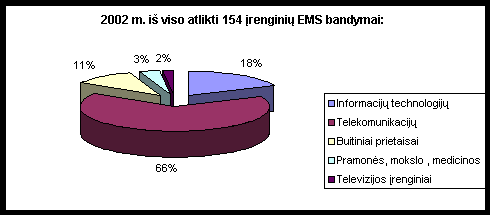 5.3. Aparatūros ir įrenginių elektromagnetinis suderinamumas Ryšių reguliavimo tarnyba tikrina, ar elektrinių, elektroninių ir telekomunikacijų įrenginių elektromagnetinio suderinamumo (EMS) parametrai atitinka Lietuvos, Europos bei kitus tarptautinius normatyvinius dokumentus (standartus, technikos taisykles).RRT Aparatūros ir įrenginių EMS kontrolės skyrius yra akredituotas Lietuvos Respublikoje, pripažįstant jo techninę kompetenciją atlikti elektromagnetinio suderinamumo bandymus šių įrenginių grupių: - informacinių technologijų įrenginių; - telekomunikacijų įrenginių; - pramonės, mokslo ir medicinos įrenginių; - radijo ir TV imtuvų bei jiems giminingų įrenginių; - buitinių prietaisų, elektrinių įrankių ir panašių aparatų; - žemės ir miškų ūkio mašinų; - kitų elektrinių ir elektroninių aparatų, naudojamų gyvenamuosiuose namuose, prekyboje ir pramonėje. Šis skyrius Lietuvos nacionaliniame akreditacijos biure nuo 1999 metų buvo akredituotas LST EN 45001 atitikčiai, o 2002 m. buvo perakredituotas LST EN ISO/IEC 17025 atitikčiai ir atnaujino savo akreditavimo sritį. Skyriaus akreditavimo sritis apima 84 Lietuvos, tarptautinius bei regioninius EMS standartus bei jų pakeitimus. 2002 metais Aparatūros ir įrenginių elektromagnetinio suderinamumo kontrolės skyrius atliko telekomunikacijų įrangos bei aparatūros ir įrenginių (ne telekomunikacijų, pvz. šaldytuvų, skalbimo mašinų ir kt.) elektromagnetinio suderinamumo parametrų tikrinimą (bandymus).