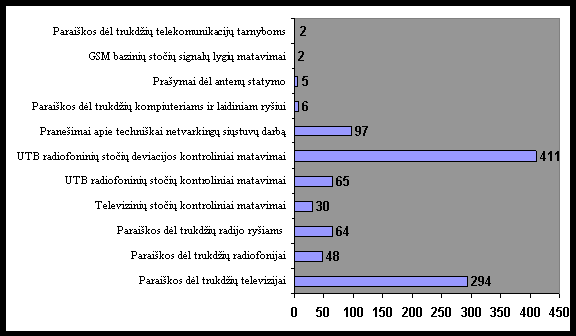 5.5. Radijo ryšio kontrolė Vilniaus, Kauno, Klaipėdos, Panevėžio, Šiaulių Radijo kontrolės skyriai inspektuoja radijo ryšio tinklus ir kontroliuoja prekybos vietas šiuose miestuose bei aplinkiniuose rajonuose. Apie atsiradusius trukdžius radijo ir televizijos programoms priimti gyventojai gali pranešti nemokamu telefonu 8 800 20030. RRT mobilioji radijo trukdžių kontrolės grupė, aprūpinta specialia aparatūra, vyksta į bet kurią šalies vietą ir išaiškina tikrąsias trukdžių priežastis. 2002 metais gautos ir išnagrinėtos 420 paraiškos dėl trukdžių priežasčių nustatymo, iš jų: - 294 paraiškos dėl trukdžių eterinei ir kabelinei televizijai; - 64 paraiškos dėl trukdžių radijo ryšiams (žinybiniai, mėgėjų, judrusis radijo ryšys ir pan.); - 48 paraiškos dėl trukdžių radiofonijai (VB, UTB); - 6 paraiškos dėl trukdžių kompiuteriams ir laidiniam ryšiui; - 2 paraiškos dėl trukdžių telekomunikacijų tarnyboms; - 5 prašymai dėl antenų statymo; - surašyta 29 radijo trukdžius skleidžiančių įrenginių patikrinimo aktai ir 3 daiktų patikrinimo protokolai. Toliau atliekami radijo ryšio siųstuvų kontroliniai matavimai. Iš viso per ataskaitinius metus išsiųsti 97 pranešimai apie techniškai netvarkingų siųstuvų darbą.