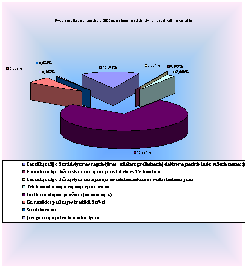 III. RADIJO RYŠYS Viena iš Ryšių reguliavimo tarnybos funkcijų, nustatytų Telekomunikacijų įstatyme, yra radijo ryšio valdymas, kurio pagrindinis tikslas - užtikrinti efektyvų bei tikslingą radijo spektro (radijo dažnių) naudojimą. RRT atsakinga už radijo dažnių (kanalų) skyrimą, jų tarptautinį koordinavimą ir apsaugą. Tarnyba išduoda leidimus, suteikiančius teisę naudoti Lietuvos Respublikos teritorijoje judriojo, fiksuotojo, palydovinio radijo ryšio tarnybų radijo siunčiamuosius įrenginius, radijo ir televizijos transliavimo stočių siųstuvus, r egistruoja radijo stotis, tvarko radijo stočių (radijo ryšio tinklų) registrus. Taip pat rengia Nacionalinę radijo dažnių paskirstymo lentelę, bendradarbiauja su kaimyninių šalių telekomunikacijų administracijų atstovais, koordinuodama Lietuvoje naudojamus radijo dažnius bei atsakydama į užsienio šalių paklausimus dėl radijo stočių koordinavimo, dalyvauja tarptautinių organizacijų (Tarptautinės telekomunikacijų sąjungos (ITU), Europos pašto ir telekomunikacijų administracijų konferencijos (CEPT)) veikloje, harmonizuojant radijo dažnių panaudojimą. Taip pat aktyviai dalyvaujama Vienos sutarties (VA99) darbo grupėse, kurių pagrindinis uždavinys yra nustatyti stočių koordinavimo procedūras bei skaičiavimo metodus.Per 2002 metus buvo išnagrinėti ir patvirtinti 928 radijo stočių projektai, išduoti 998 leidimai radijo stotims projektuoti ir 3758 leidimai jas eksploatuoti. Parengta ir pateikta Lietuvos Respublikos Vyriausybei Nacionalinė radijo dažnių paskirstymo lentelė. Specialiame, Vokietijoje vykusiame, CEPT š alių spektro inžinerijos darbo grupės (WG SE PT 27) posėdyje pristatytas RRT parengtas dokumentas skaitmeninės televizijos (DVB-T) ir karinių aeronavigacinių sistemų (RSBN) suderinamumo klausimais, buvo suformuluota bendra CEPT šalių pozicija šiuo klausimu. Ši palanki Lietuvai pozicija buvo patvirtinta birželio 10-14 dienomis vykusiame CEPT/ECC WG SE grupės posėdyje.Surengtos trejos radijo dažnių koordinavimo derybos, iš kurių dvejos dvišalės, vienerios daugiašalės. 2002 metų birželio mėn. Vilniuje įvyko tarptautinės derybos su Rusijos Federacijos ryšių administracija dėl radijo dažnių, skirtų judriajai ir fiksuotajai tarnyboms, pasidalijimo pasienio zonoje. Derybų metu buvo aptarti aktualūs radijo dažnių paskirstymo judriosios bei fiksuotos radijo ryšio tarnybų stotims šalių interesų susikirtimo erdvėje aspektai. Pasirašyti 5 susitarimai, įtvirtinantys šalių sprendimus pasidalinti radijo dažnius 162-172 MHz, 385-390 MHz, 440-450 MHz, 453-457,475 MHz, 3410-3800 GHz, 10,15-10,3 GHz bei 24,5-26,5 GHz juost ose.RRT specialistai koordinavo televizijos transliuotojų ir siuntėjų veiksmus, keičiant televizijos spalvų kodavimo sistemą iš SECAM į PAL ir bendru sutarimu su transliuotojais ir siuntimo operatoriais parinko tinkamiausią stereo garso sistemos standartą.