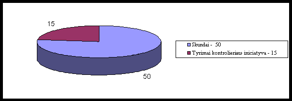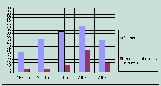 Taigi palyginus su ankstesniaisiais ataskaitiniais laikotarpiais, akivaizdu, kad skundų ir kontrolieriaus iniciatyva atliktų tyrimų skaičius nežymiai sumažėjo. Taigi 1999 m. gautas 31 skundas, kontrolieriaus iniciatyva atlikti 4 tyrimai, 2000 m. gauti 52 skundai, kontrolieriaus iniciatyva atlikti 5 tyrimai, 2001 m. gauti 63 skundai ir kontrolieriaus iniciatyva atlikta 10 tyrimų, 2002 m. gauti 72 skundai ir atlikti 34 kontrolieriaus inicijuoti tyrimai, o 2003 m. gauta 50 skundų, kontrolieriaus iniciatyva atlikta 15 tyrimų dėl galimų moterų ir vyrų lygių galimybių pažeidimų (2pav.).