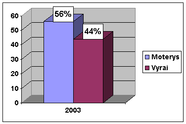 Aptariant pasiskundusių asmenų lytį, galima pastebėti, kad tendencijos išlieka tos pačios: daugiau nei pusė pasiskundusiųjų yra moterys, tačiau vyrai taip pat nelinkę nutylėti diskriminacijos faktų (3 pav.). Tarnybos praktika rodo, kad vyrai, priešingai nei moterys, labai impulsyviai reaguoja į savo teisių pažeidimus lygių galimybių srityje ir, nesistengdami konfliktą išspręsti taikiomis priemonėmis ar ieškoti kompromisų, dažniausiai ryžtasi pateikti skundą lygių galimybių kontrolieriui. Moterys ieško lankstesnių, diplomatiškesnių problemos sprendimo būdų. Gavusios patarimą ar teisinę konsultaciją, jos dažnai nusprendžia nerašyti skundo ir savo jėgomis kovoti su teisių pažeidėjais. Nepavykus išspręsti ginčo taikiu būdu, derybomis, jos naudojasi įstatymo suteikta teise kreiptis į lygių galimybių kontrolierių. Susitikimų su visuomene, seminarų, konferencijų dalyviai mano, kad į tarnybą kreipiasi tik moterys, nukentėjusios nuo diskriminacijos, ir labai nustemba sužinoję, kad vyrai yra ne mažiau aktyvūs. 3 pav. Asmenų, pateikusių skundus, pasiskirstymas pagal lytį: