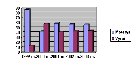 Apibendrinant penkis Lygių galimybių kontrolieriaus tarnybos atsiskaitomuosius laikotarpius, pažymėtina, kad didžiąją daugumą besikreipiančių asmenų sudaro moterys, išskyrus 2000 metus, kai į tarnybą dėl savo pažeistų teisių žymiai dažniau kreipėsi vyrai (4 pav.).