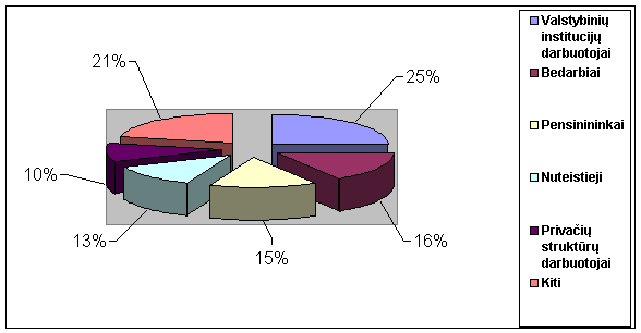 Kaip ir ankstesniais metais, taip ir 2003 metais, didžiąją dalį į tarnybą besikreipiančių asmenų sudarė valstybės tarnautojai, biudžetinių įstaigų darbuotojai. Tačiau būtina atkreipti dėmesį, kad jie kreipėsi ne tik dėl galimos diskriminacijos lyties pagrindu valstybinėse institucijose, bet ir dėl teisės aktų nuostatų, galimai pažeidžiančių moterų ir vyrų lygias galimybes. Nuteistieji, bedarbiai ir pensininkai tai dar 3 socialinės grupės, kurių atstovai jautėsi diskriminuojami dėl lyties ir ryžosi apginti savo pažeistas teises Lygių galimybių kontrolieriaus tarnyboje. Šių trijų socialinių grupių atstovai turi pakankamai daug laiko domėtis pokyčiais, vykstančiais šalies ekonominiame, politiniame, kultūriniame gyvenime, analizuoti juos, turint omenyje lyčių lygybės aspektą, ir, įvertinę situaciją, kreiptis į tarnybą dėl galimos diskriminacijos. Minėtų trijų socialinių grupių atstovai pateikia skundus ne dėl diskriminacijos darbo santykiuose, bet dėl lygių galimybių pažeidimų reklamoje, teisės aktų nuostatų, o taip pat dėl moterų ir vyrų lygių galimybių pažeidimų vartotojų teisių apsaugos srityje. 8 pav. Asmenų, pateikusių skundus, pasiskirstymas pagal socialines grupes: 2003 metais, kaip ir ankstesniais laikotarpiais, daug tyrimų buvo atlikta dėl galimų moterų ir vyrų lygių galimybių pažeidimų privačiose įmonėse, įstaigose, organizacijose (dažniausiai susiję su diskriminaciniais skelbimais žiniasklaidoje). Tačiau 2003 metais, palyginus su 2002 metais, buvo atlikta daugiau tyrimų dėl galimų Moterų ir vyrų lygių galimybių įstatymo pažeidimų valstybės tarnyboje, iš valstybės biudžeto finansuojamose įstaigose bei organizacijose (9 pav.).