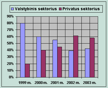 9 pav. Atliktų tyrimų valstybiniame ir privačiame sektoriuje pasiskirstymas ataskaitiniais laikotarpiais: